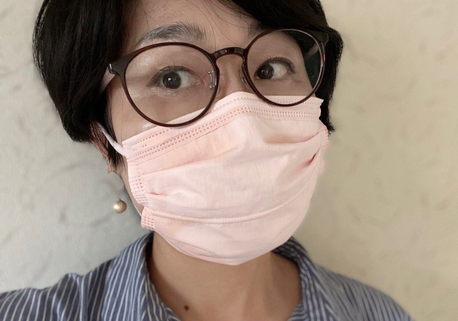 さっそく着けてみました。ノーズワイヤー入りで、ぴったりフィットします。着けた感じは本当に不織布マスクのよう。パッと見た感じは布マスクには見えません。しかしサラッとひんやりした生地で、肌触りは不織布とは全然違います。真ん中にもワイヤーが入っている為、口のあたりに少し空間ができるのもいいですね。耳ゴムも太く柔らかく、不織布よりも優しい付け心地です。