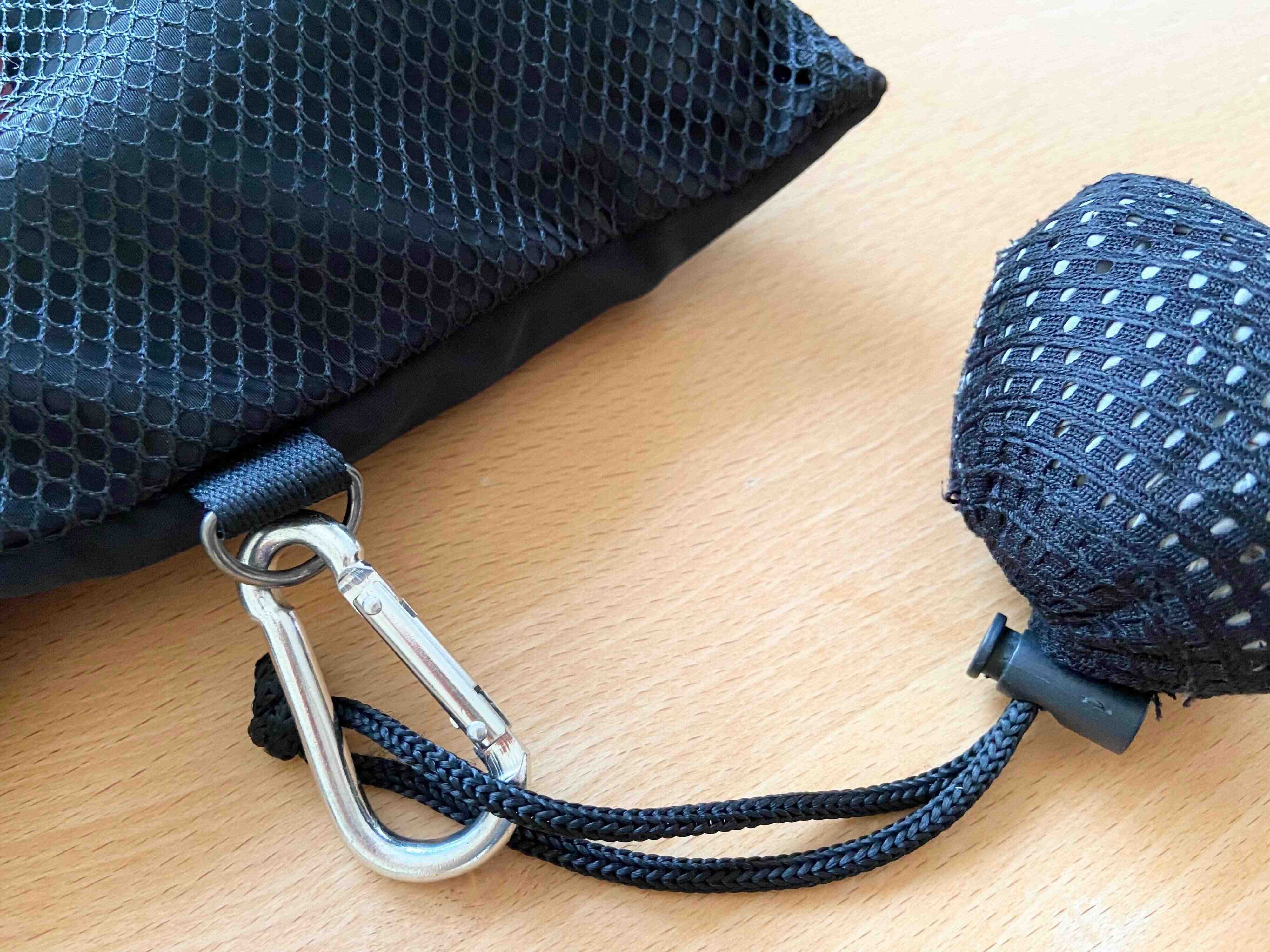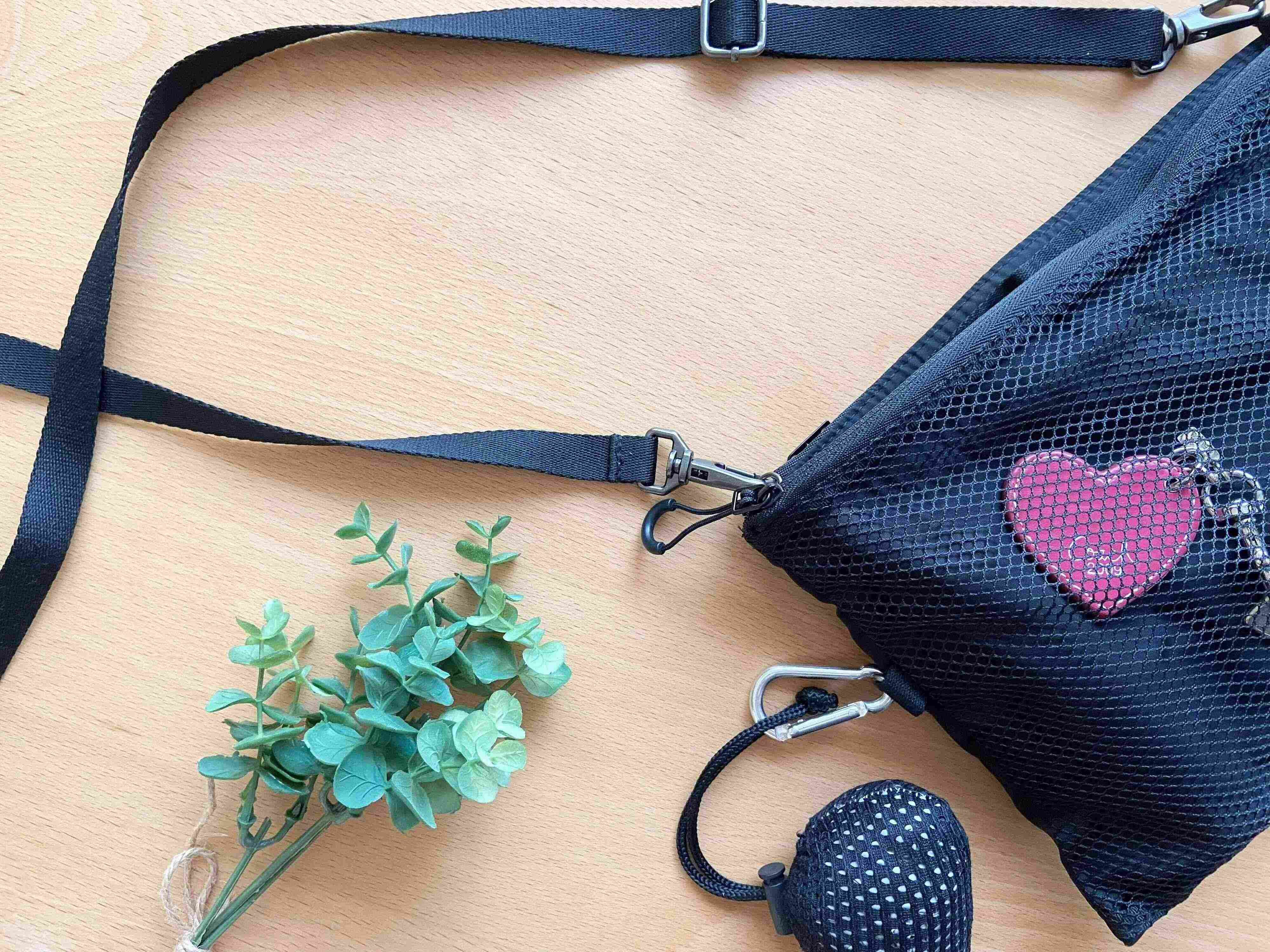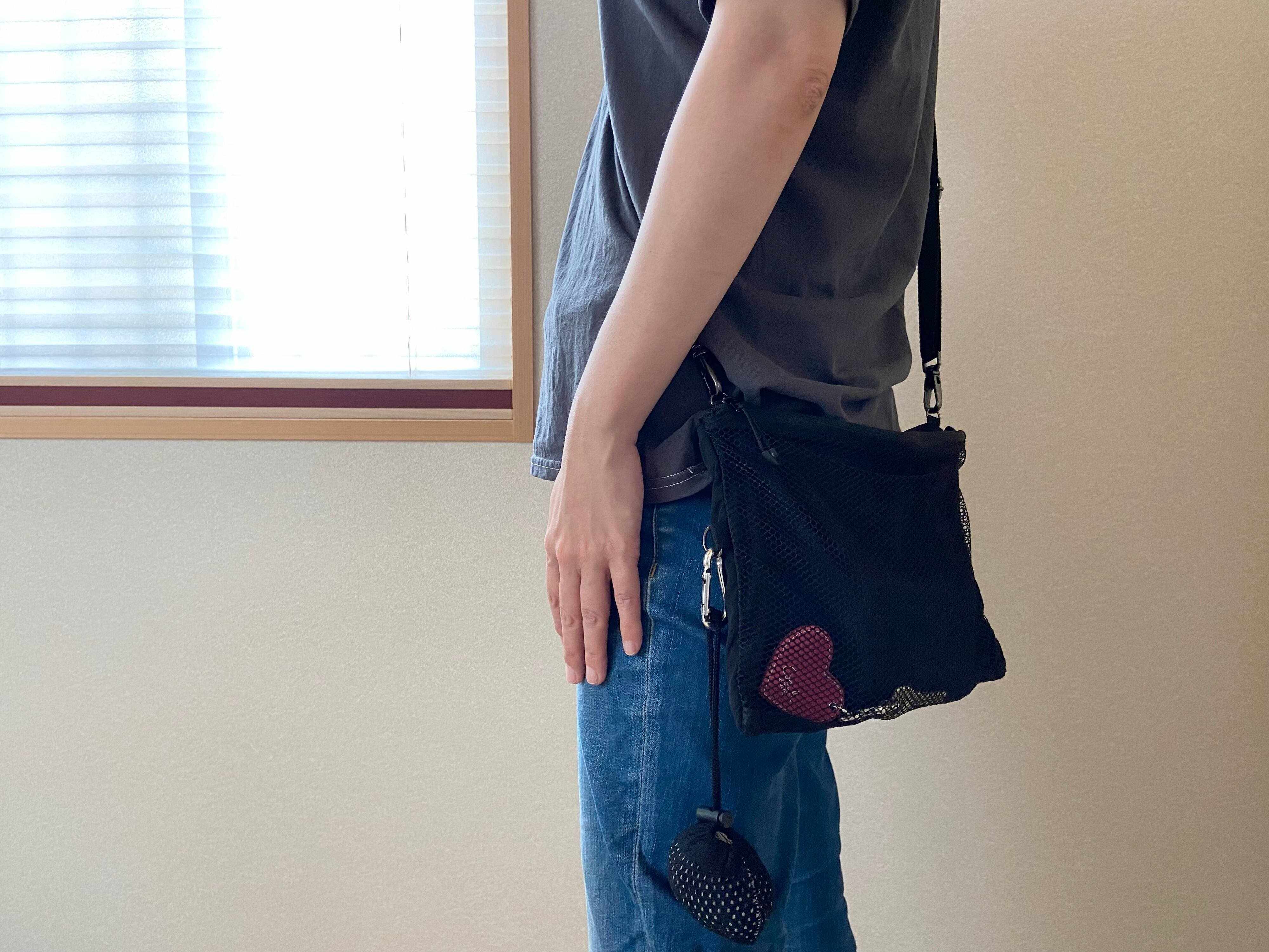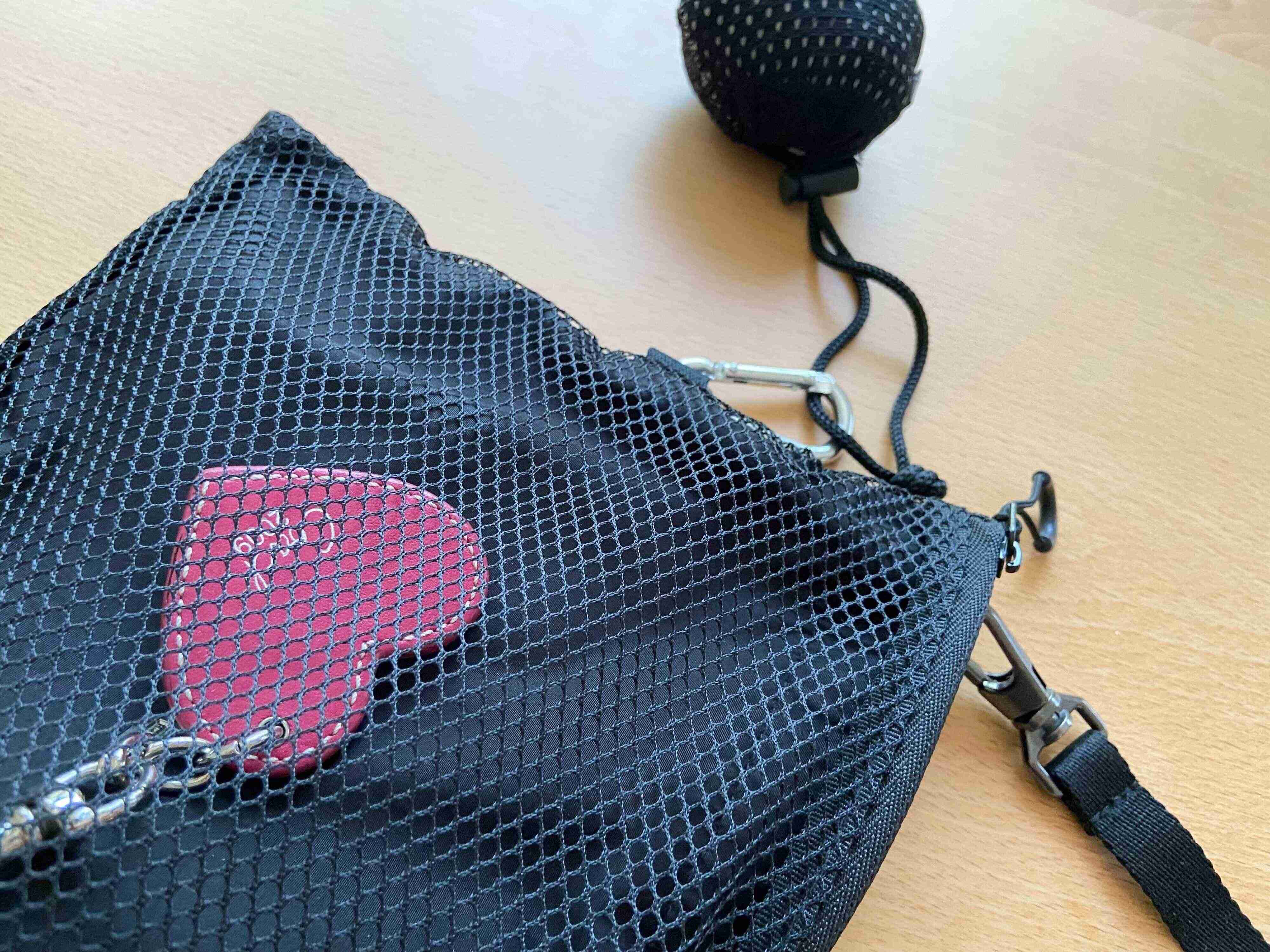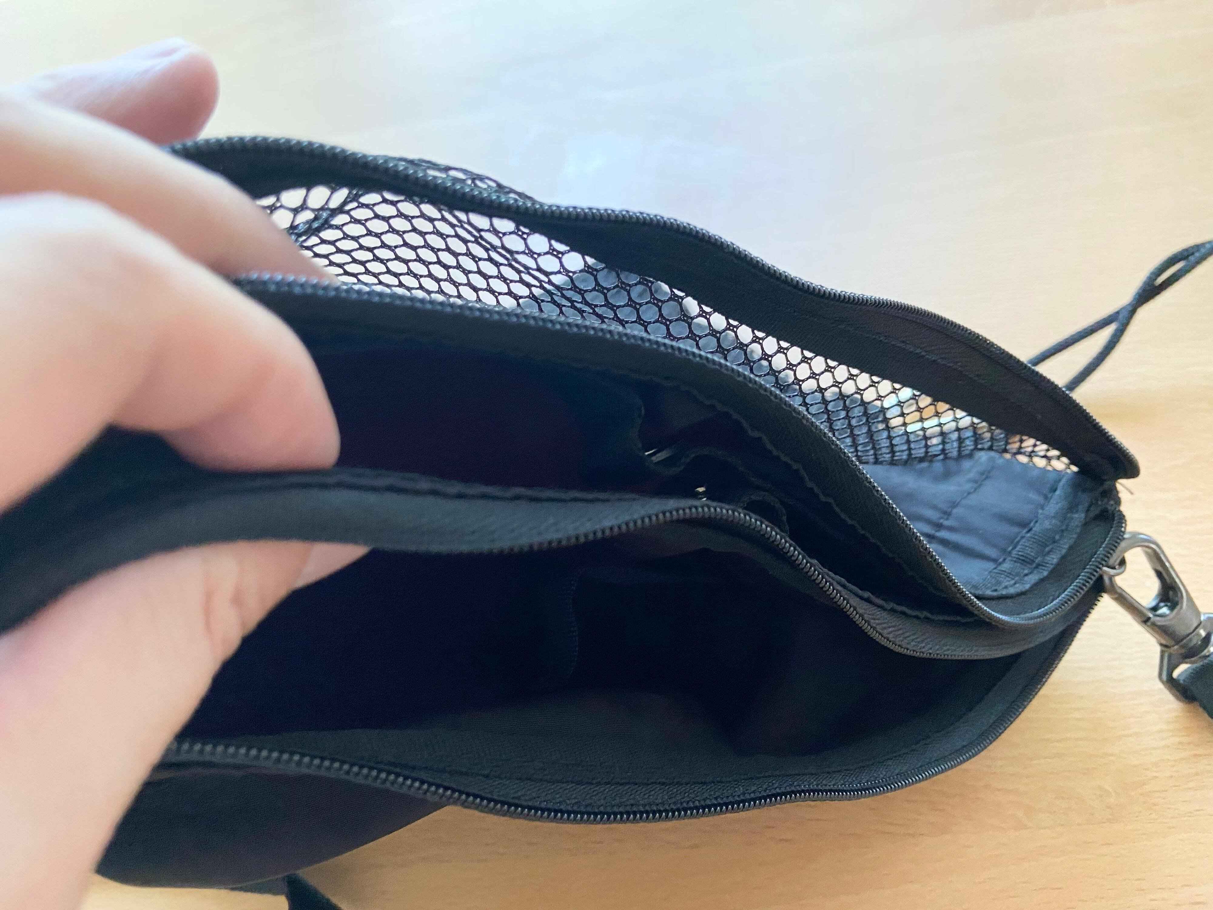 反対側のポケットはメッシュポケットになっているので中身が見えるようになっています。私の場合は、見えないようになっていると鍵を探しがちなのでこちらへ。外から見えますが、ファスナーつきのポケットなのでなくなる心配もありません。