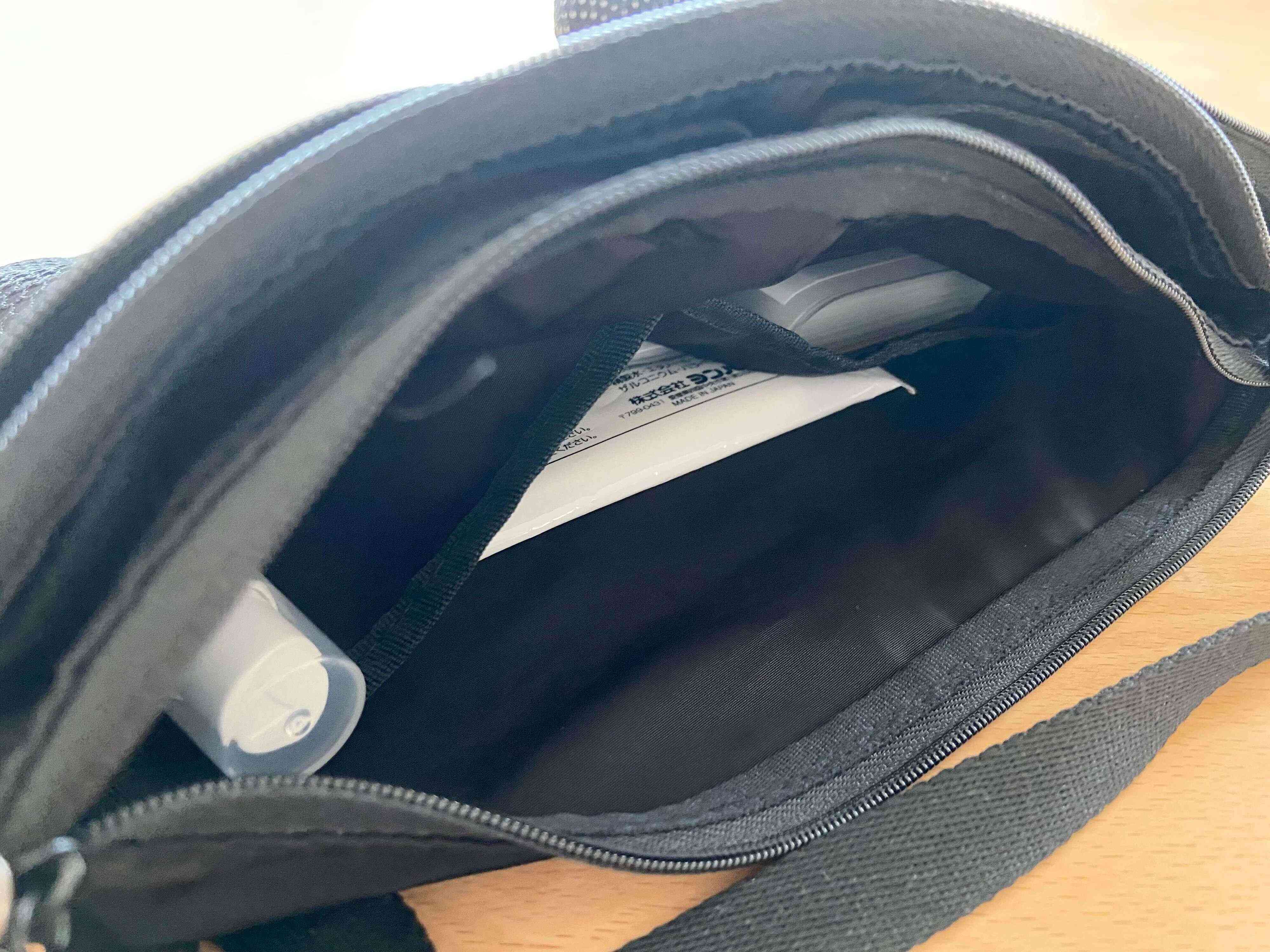 無印良品の小さめで肩からかけられるバッグというと撥水サコッシュ(990円)が人気ですが、私の圧倒的なお気に入りは「ポリエステルダブルファスナーケース・ショルダー付(1,490円)」!