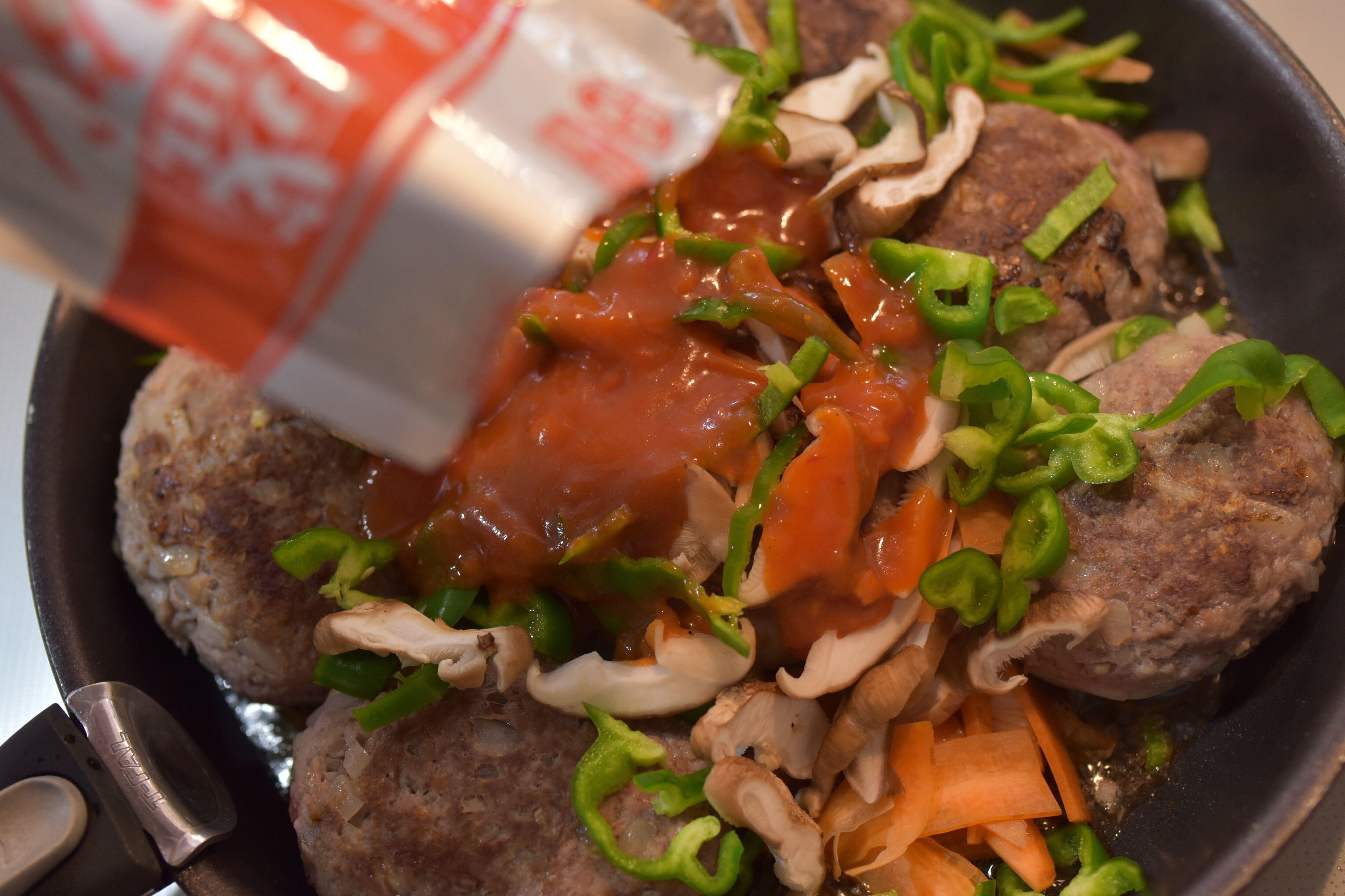 ハンバーグの両面に焼き色が付くまで焼いたら、フライパンに野菜とナポリタンソースを入れます。その際に水を50㏄程入れると、ソースが薄まり焦げ付きにくくなります。