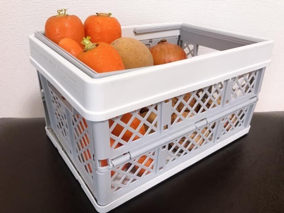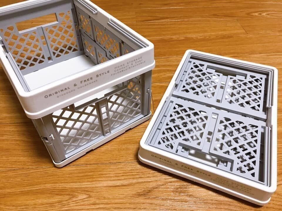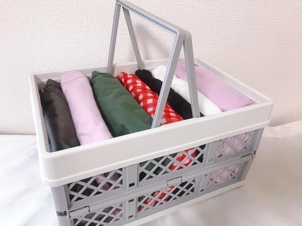 今回ご紹介する3COINSの折り畳みコンテナは、使わない時はコンパクトに折りたためて、使う時はパッと一瞬で広がり、たくさん収納ができるし、取っ手が付いているので、持ち運びもラクラクです。