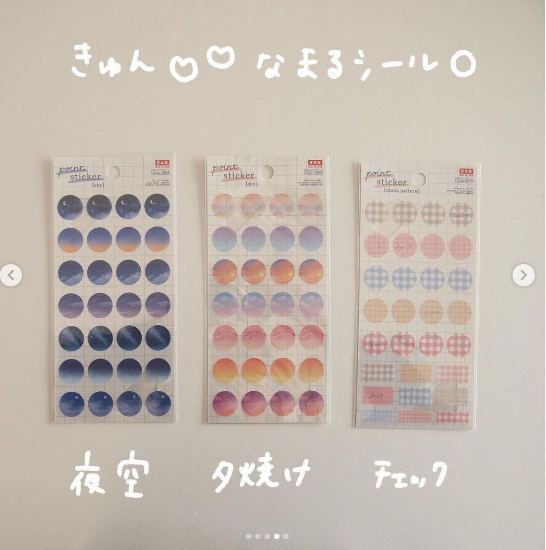 夜空や夕焼けの空、チェック柄など、色柄違いで集めたくなるおしゃれなポイントステッカーです。ちょうどよいサイズ感ところんとした形なので、手帳のアクセントに使ったり、カレンダーに貼って目印にしたりするのも素敵ですね。