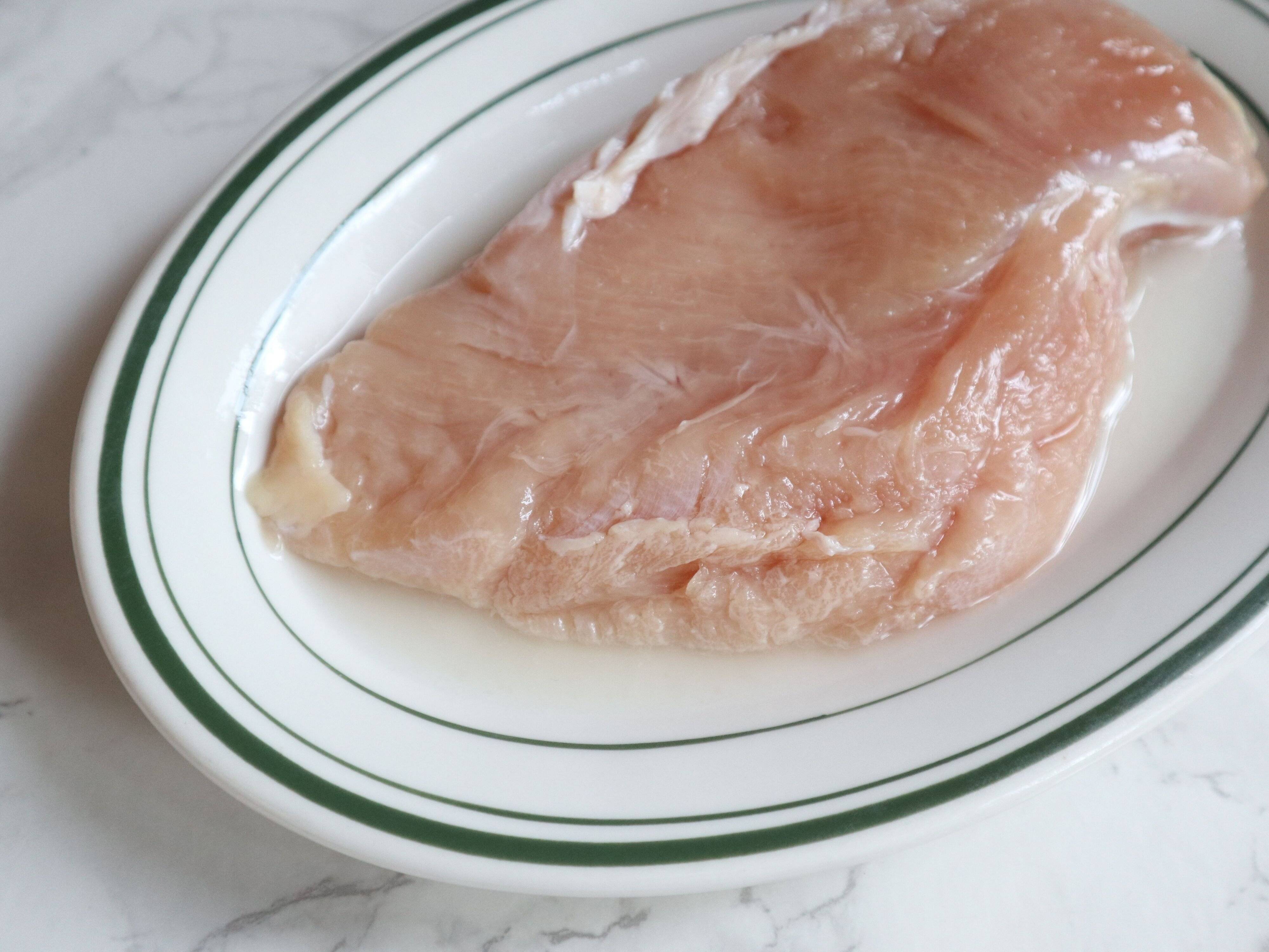 鶏むね肉(1枚)はフォークで穴をあけて、耐熱皿にのせて料理酒大さじ1、塩小さじ1/2をふりかけて、ふわっとラップをかけて600W電子レンジで2分加熱して、ひっくり返してさらに2分加熱したら完成です。