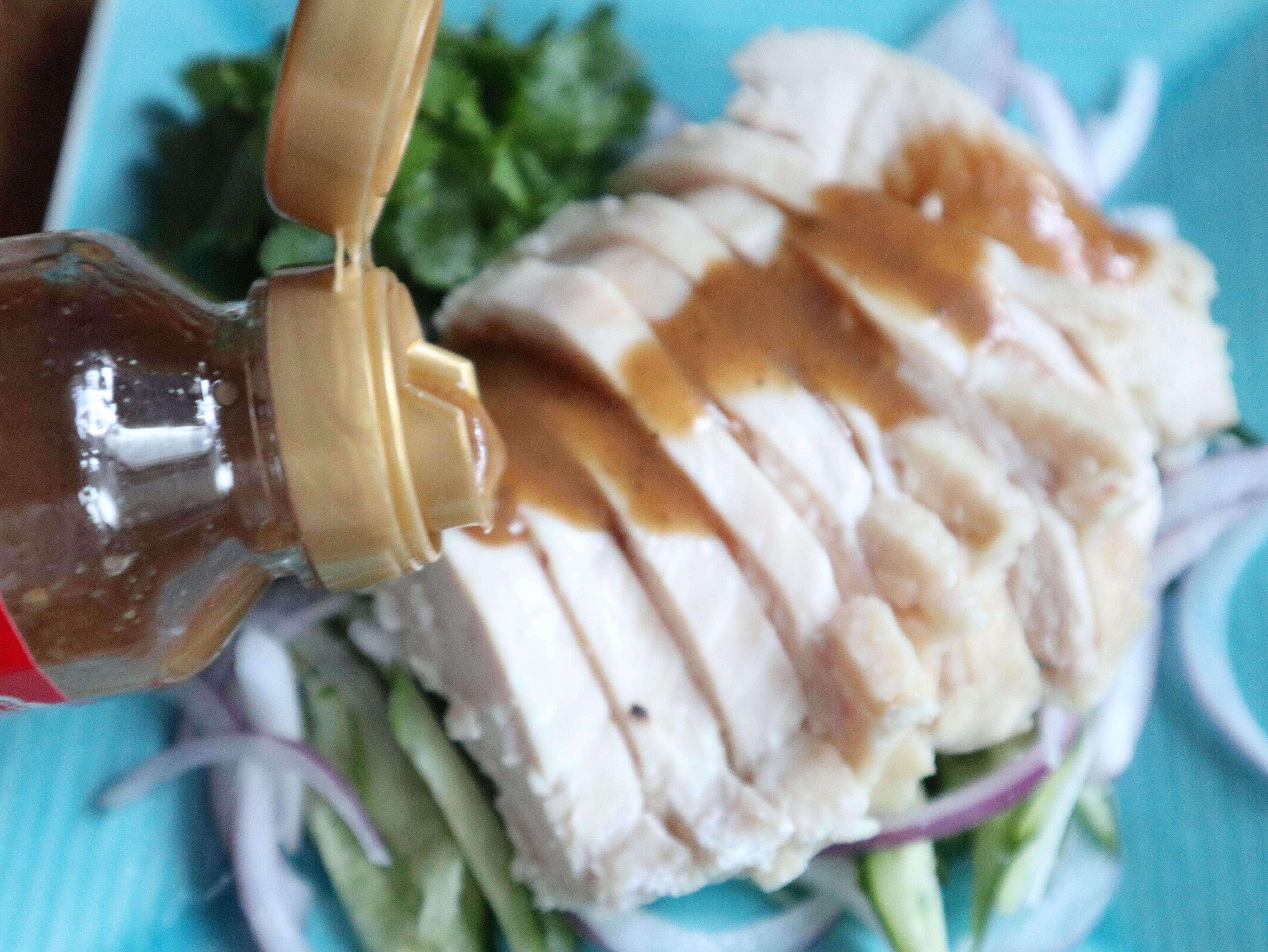 器にきゅうり(1本)の千切り、紫玉ねぎ(1/4玉)の千切り、蒸し鶏をのせて、しびれ麻辣だれをかけます。お好みでパクチーを添えるのもおすすめです。