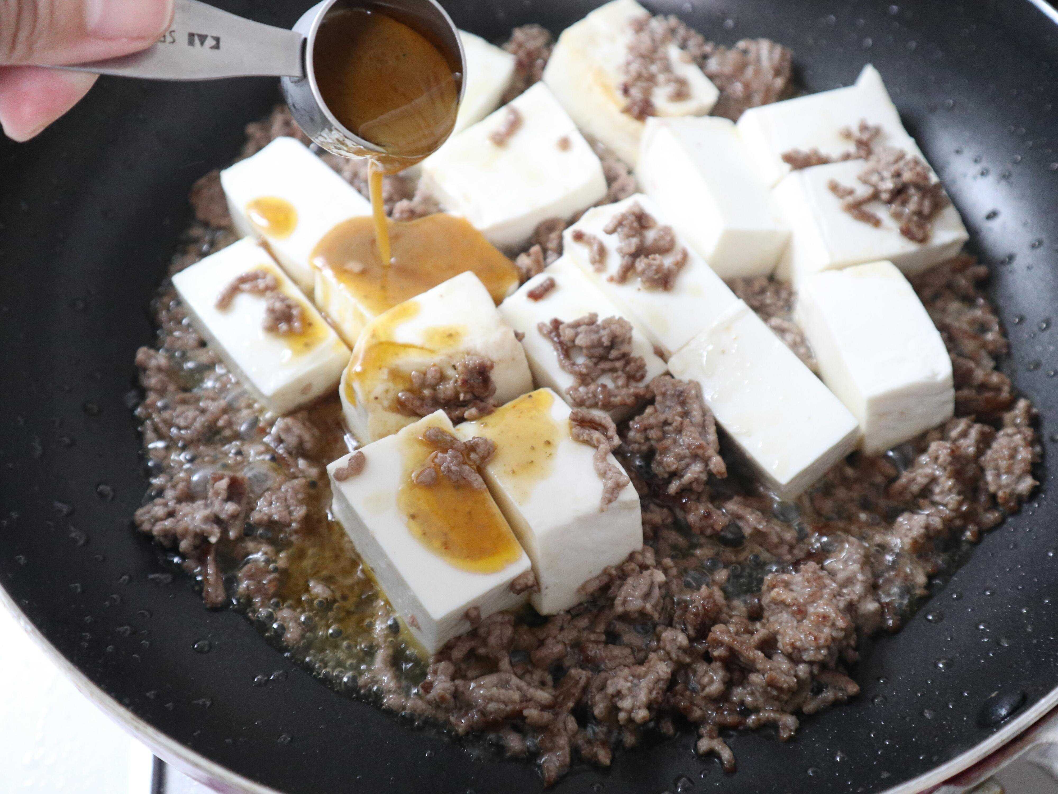 2.ひき肉に火が通ったら、適当に切った豆腐、しびれ麻辣だれを加えて3分ほど炒め煮する。