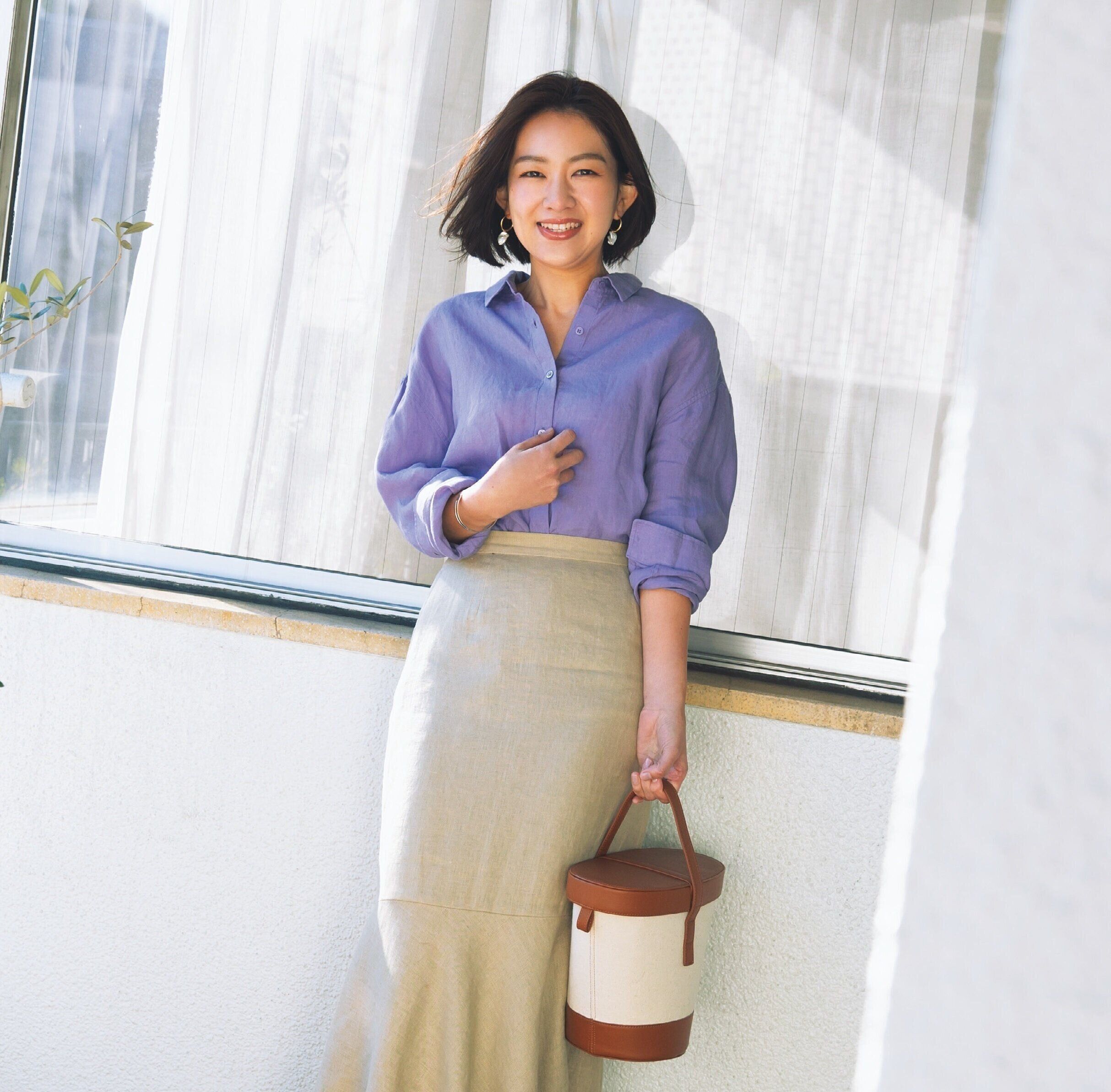リネンシャツ¥8,690、マーメイドスカート¥9,790/ビーミング by ビームス(ビーミング ライフストア by ビームス アーバンドック ららぽーと豊洲店TEL03・3532・3100) バッグ¥10,780/ソグリアhttps://soglia.official.ec サンダル¥15,950/ダイアナ(ダイアナ 銀座本店TEL03・3573・4005)ピアス¥2,200/イヤーイヤー https://bhselect.base.shop/ バングル¥3,300/Mignonjour(Room403 表参道本店TEL03・6452・6707)