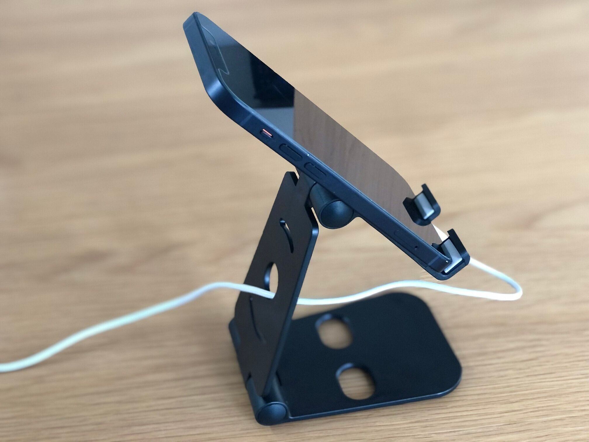 写真のとおり、スタンドに置いた状態でもケーブルがスッキリと通せるから、充電しながらでも邪魔になりません。仕事中など、いつでもスマートフォンの画面が見えるようにしておけば、電話や通知を見逃すこともなくなりそうですね。