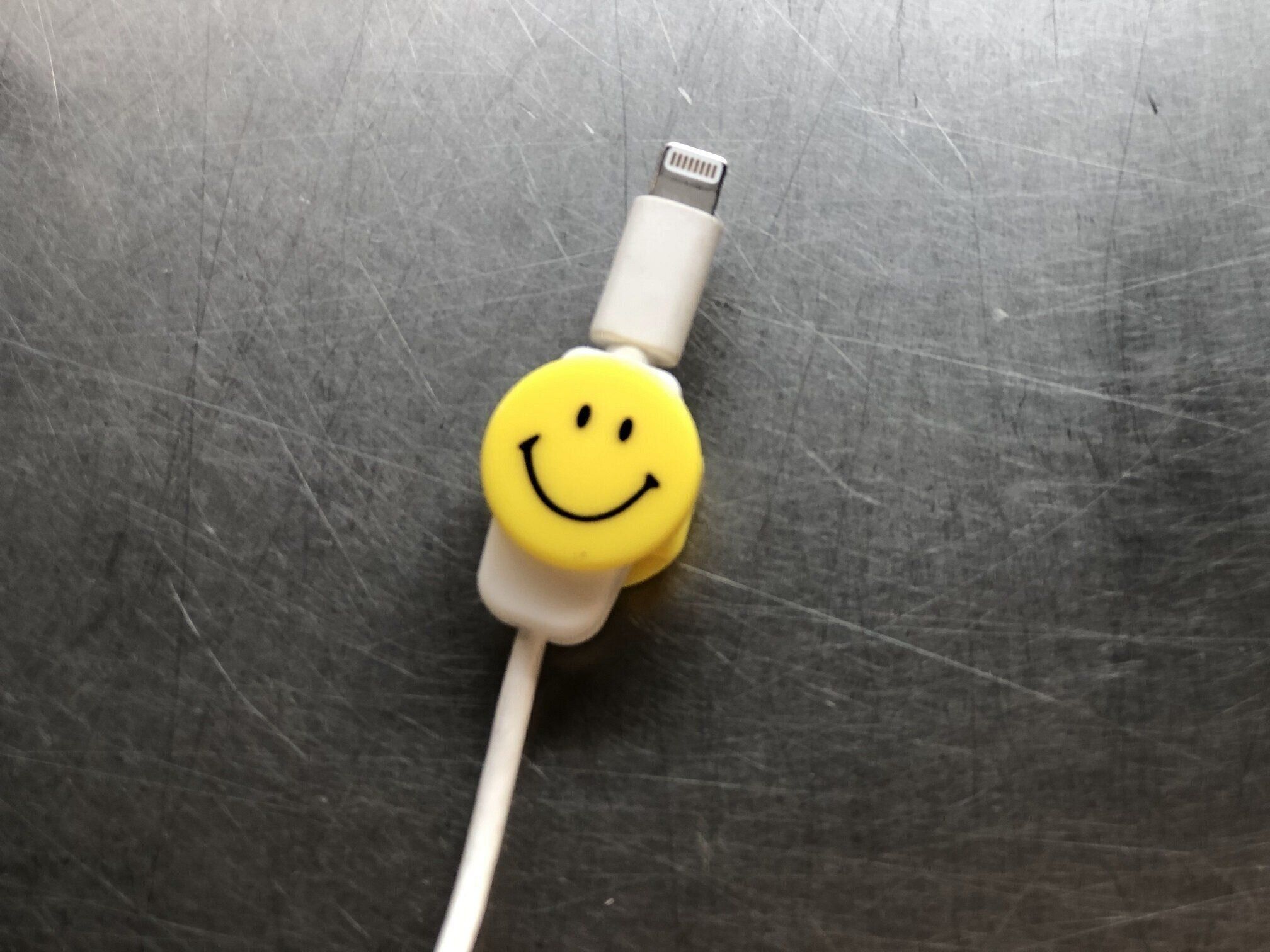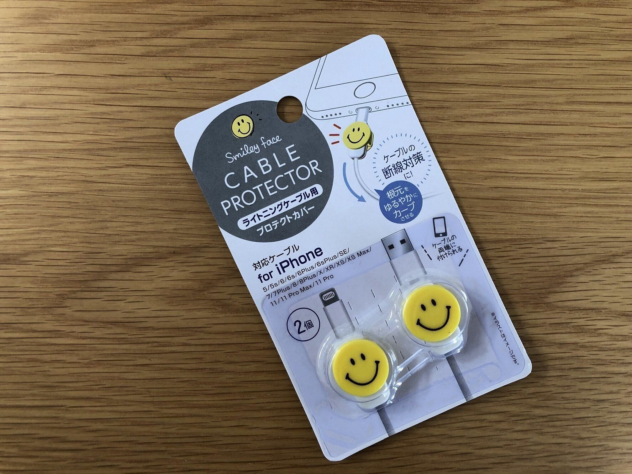 ニコちゃんマークがかわいいカバーもありました。商品名は「ケーブルプロテクター スマイリー」で、価格は110円です。