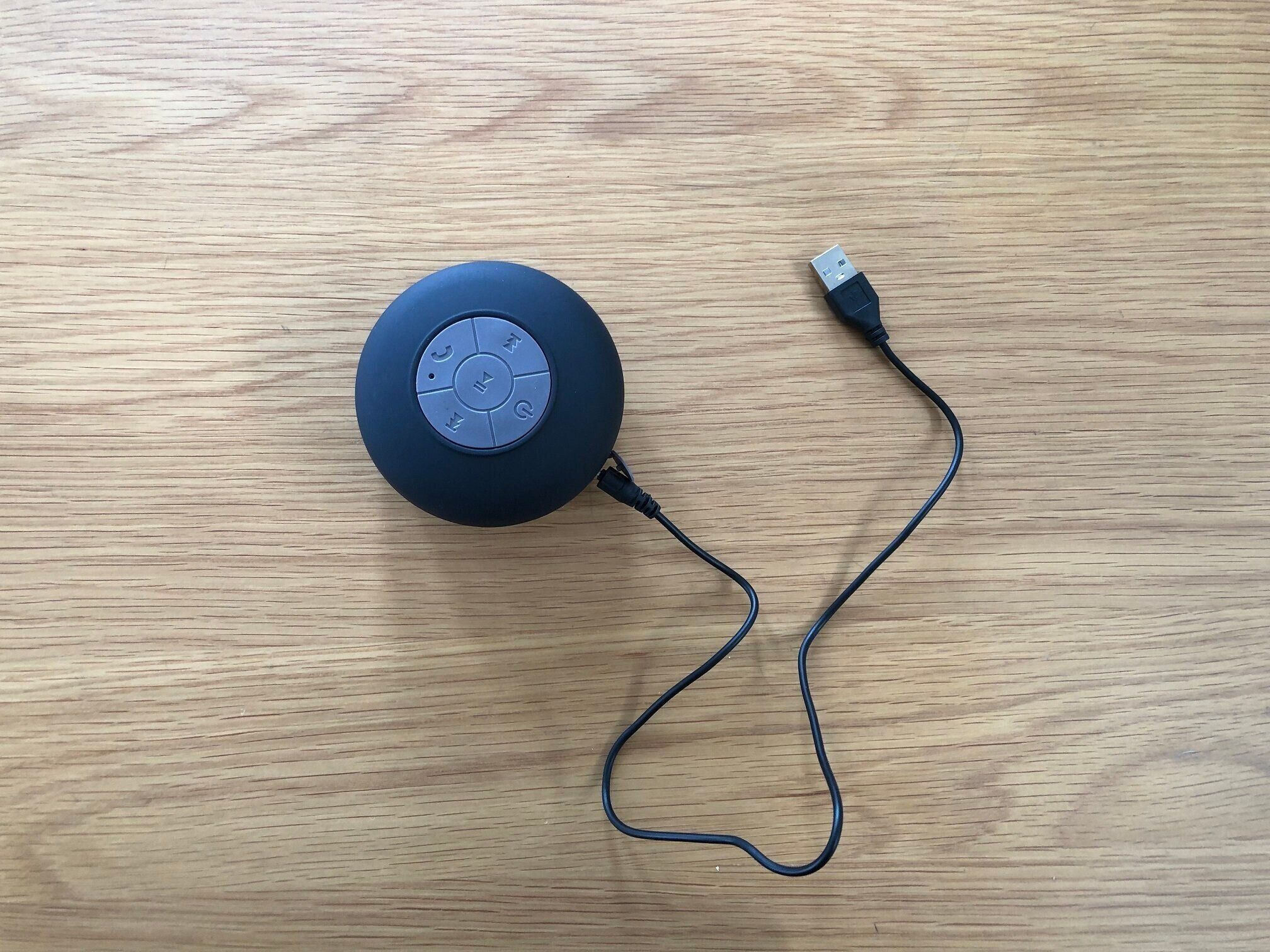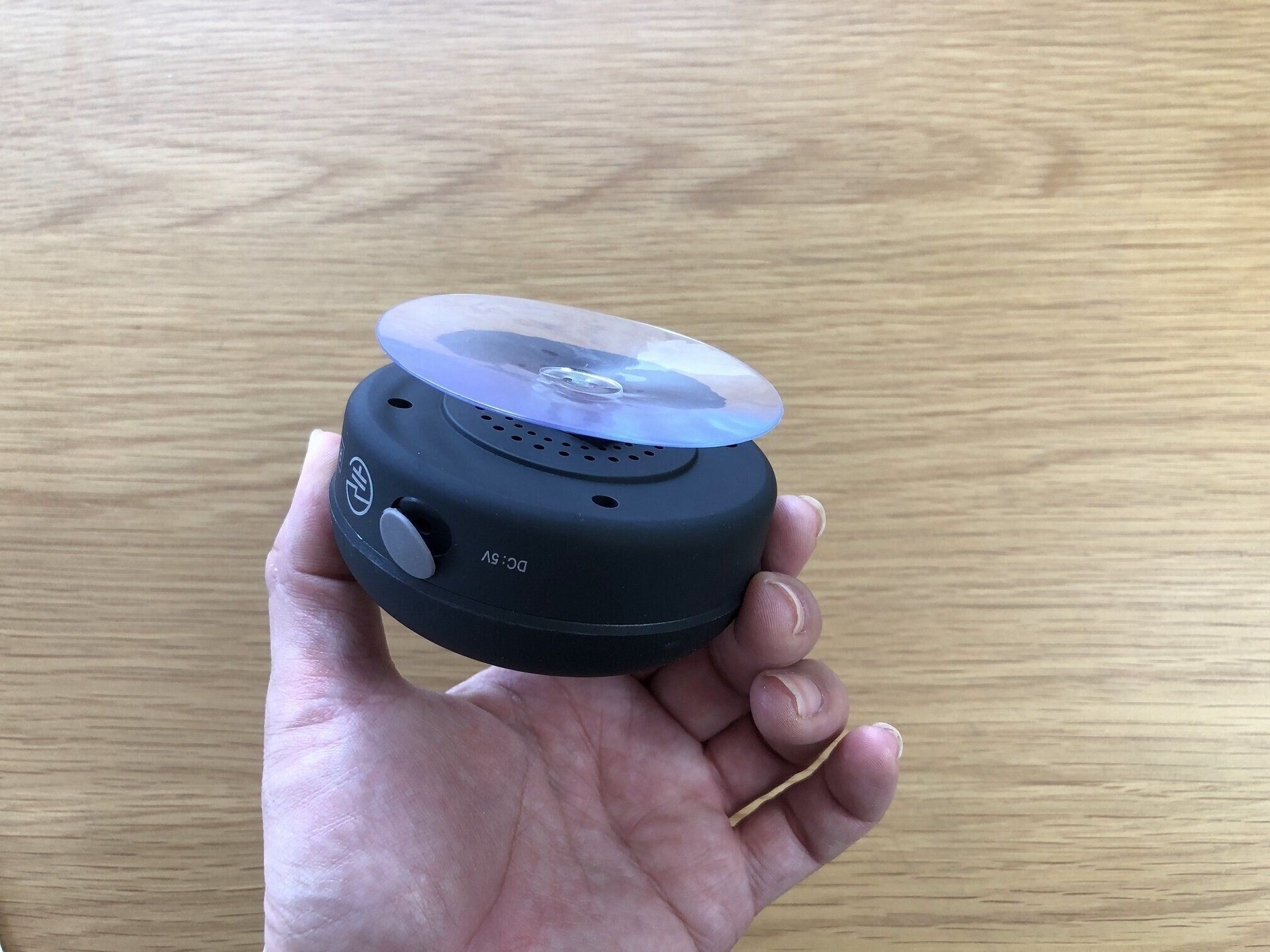 直径約8cm、厚み最大約5cmで、まるくてかわいいフォルムが印象的なアイテム。その名も「Bluetoothスピーカー2」。防滴仕様でお風呂でも使えるスピーカーなのです。