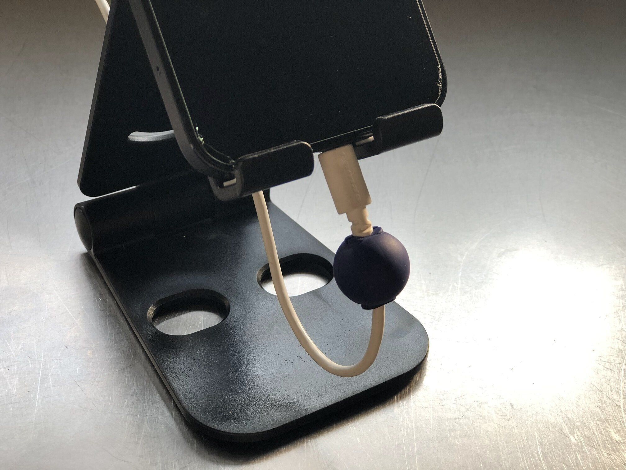 とくに負担がかかりやすい、ケーブルと端子の境目を長四角のガードで挟み、球体のパーツで留めるアイテムです。