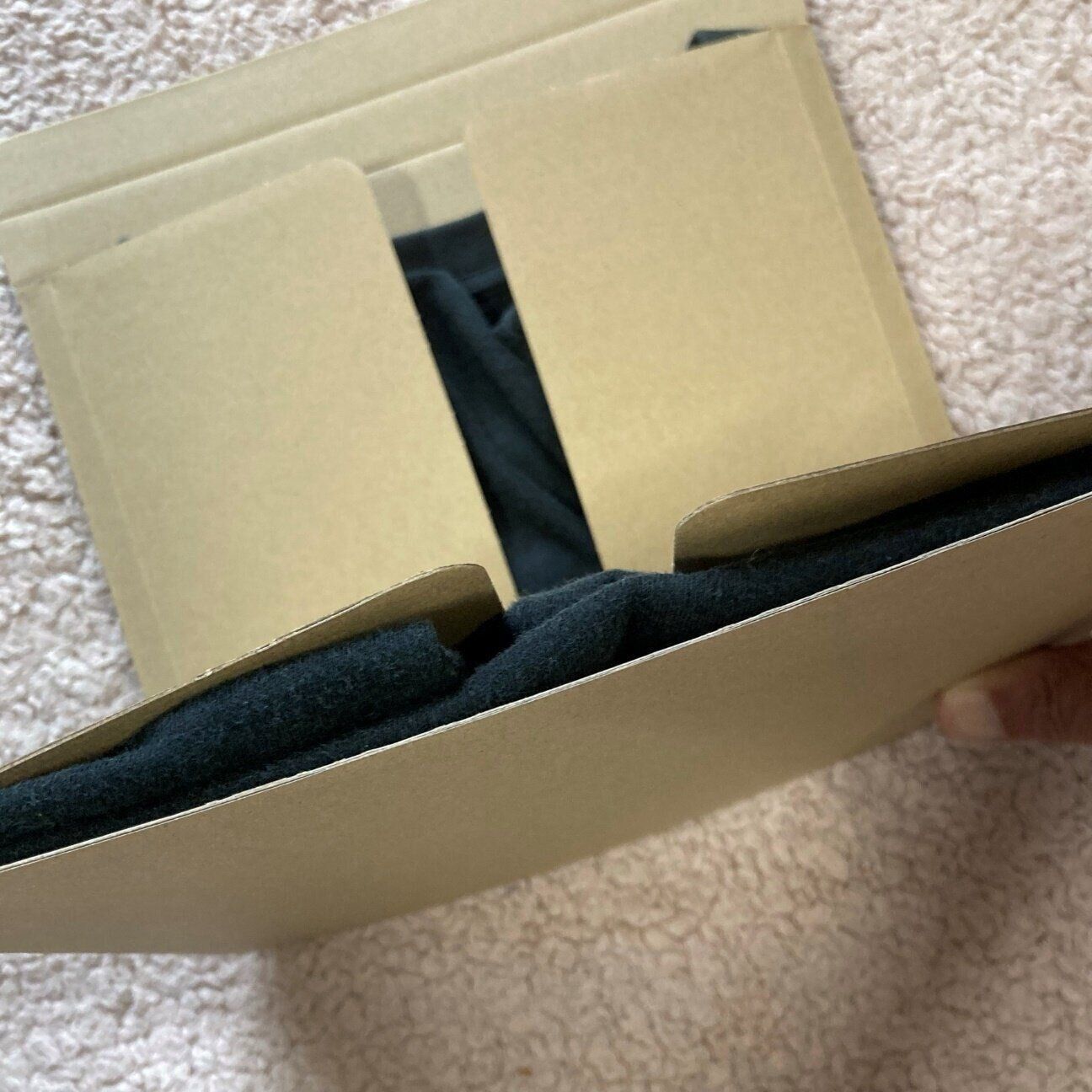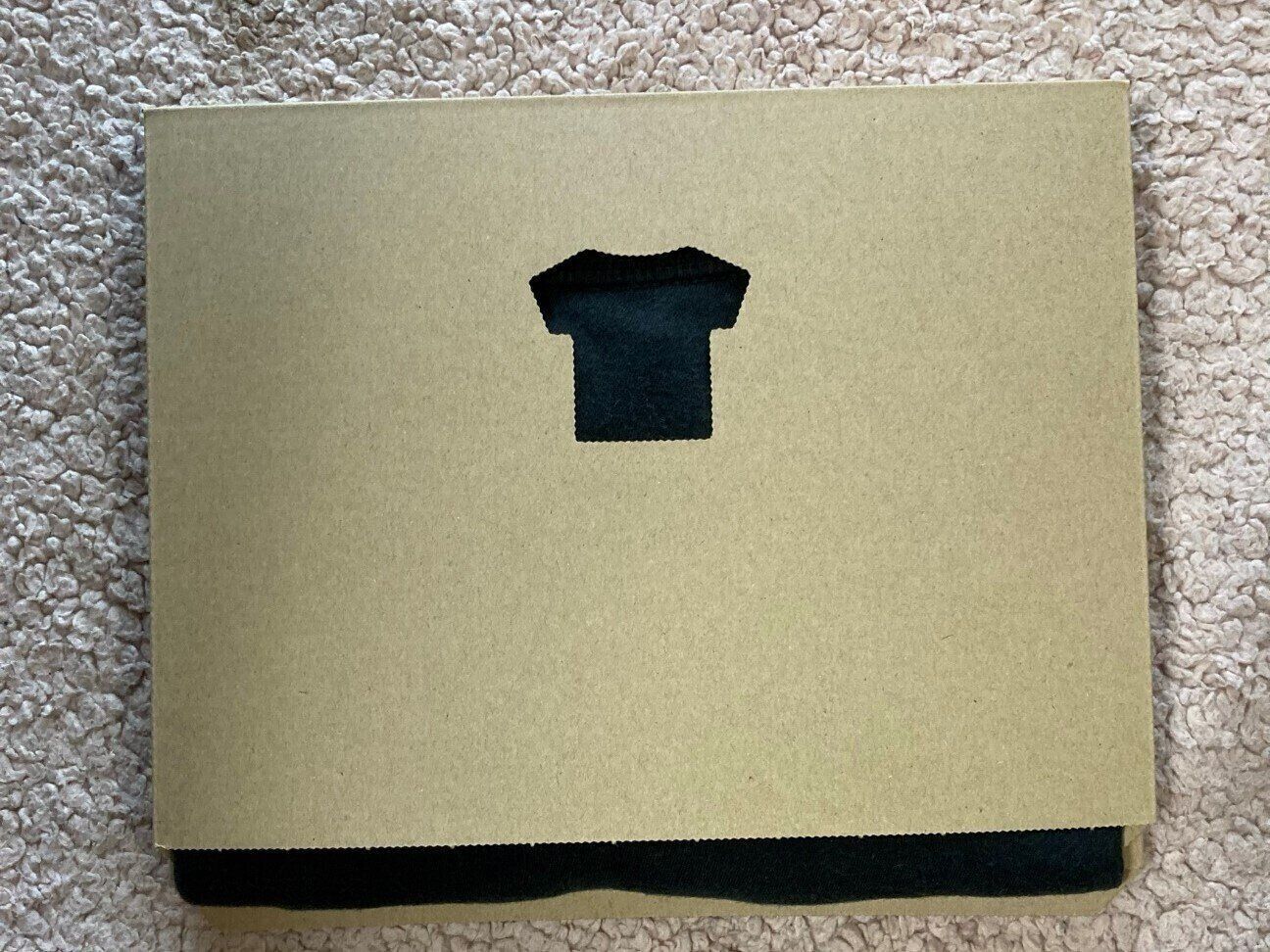 片側の口は大きく開いて、本棚に並べても色がよくわかるようになっています。また、本体にはTシャツ型の穴が開いていているので、Tシャツのデザインが見えるように折りたためば、Tシャツのデザインも確認できます。ちょっと気が利いていますよね。