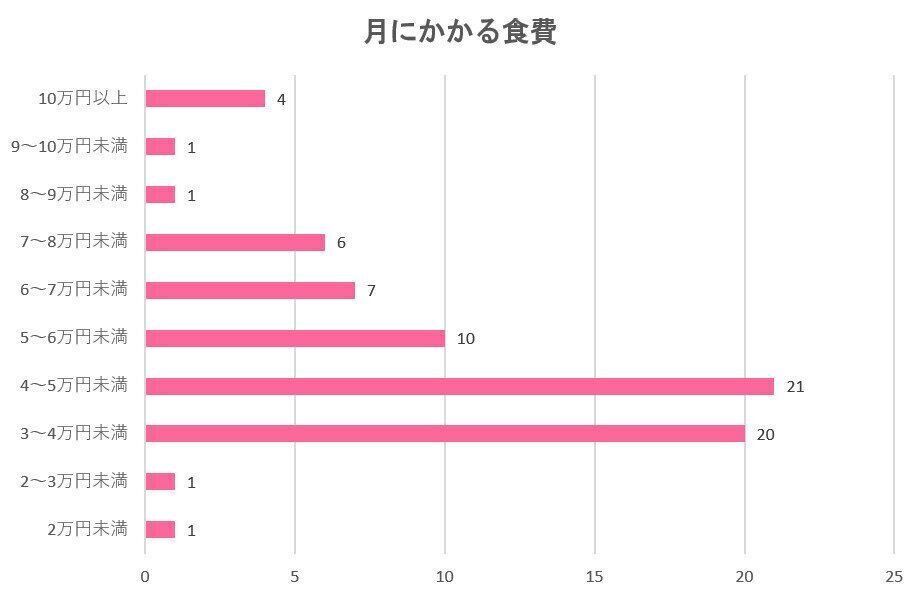 各家庭の世帯数や、毎月どのくらいの食材を消費するのかによっても変わってきますが、世帯家族数が1名~2名だと、ひと月にかかる食費は3~5万円未満。世帯家族数が3名以上になると、月に4~5万円未満と回答されているかたが最も多かったです。