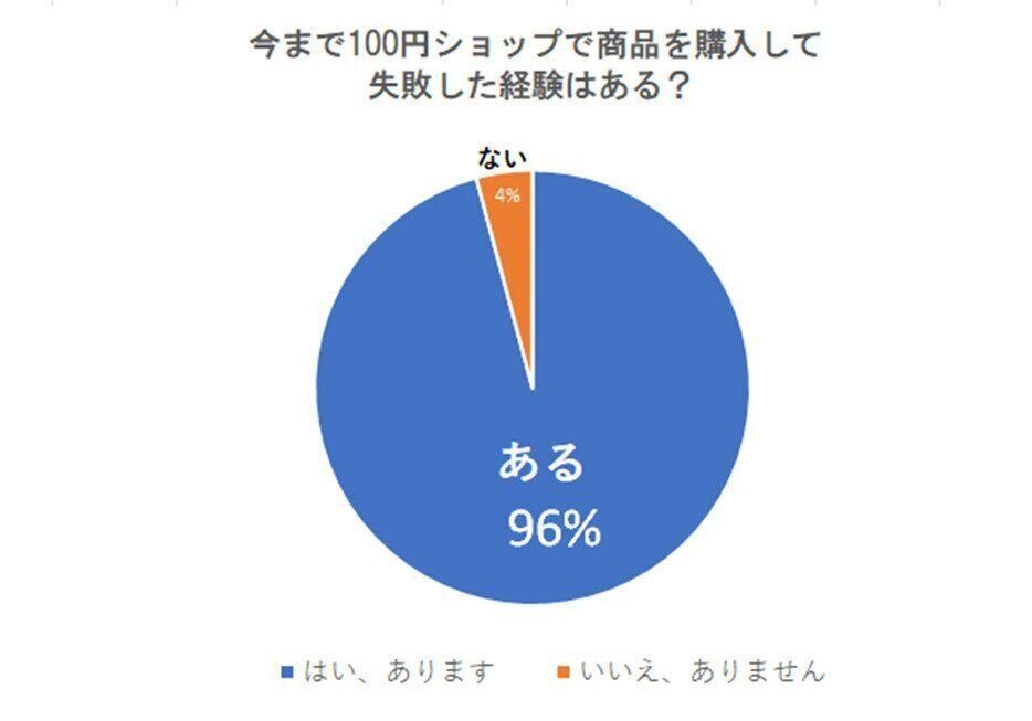 「今まで100円ショップで買って失敗した経験はありますか?」という質問に対して「ある」と答えた人がなんと96%。ほとんどの人が失敗をした経験をもっていることがわかります。