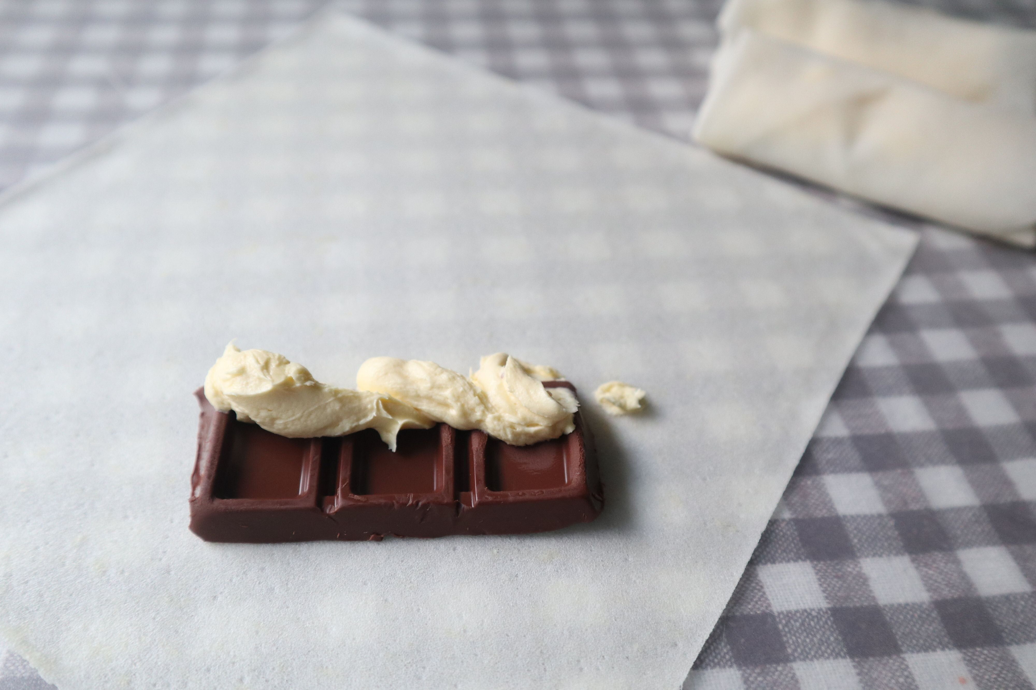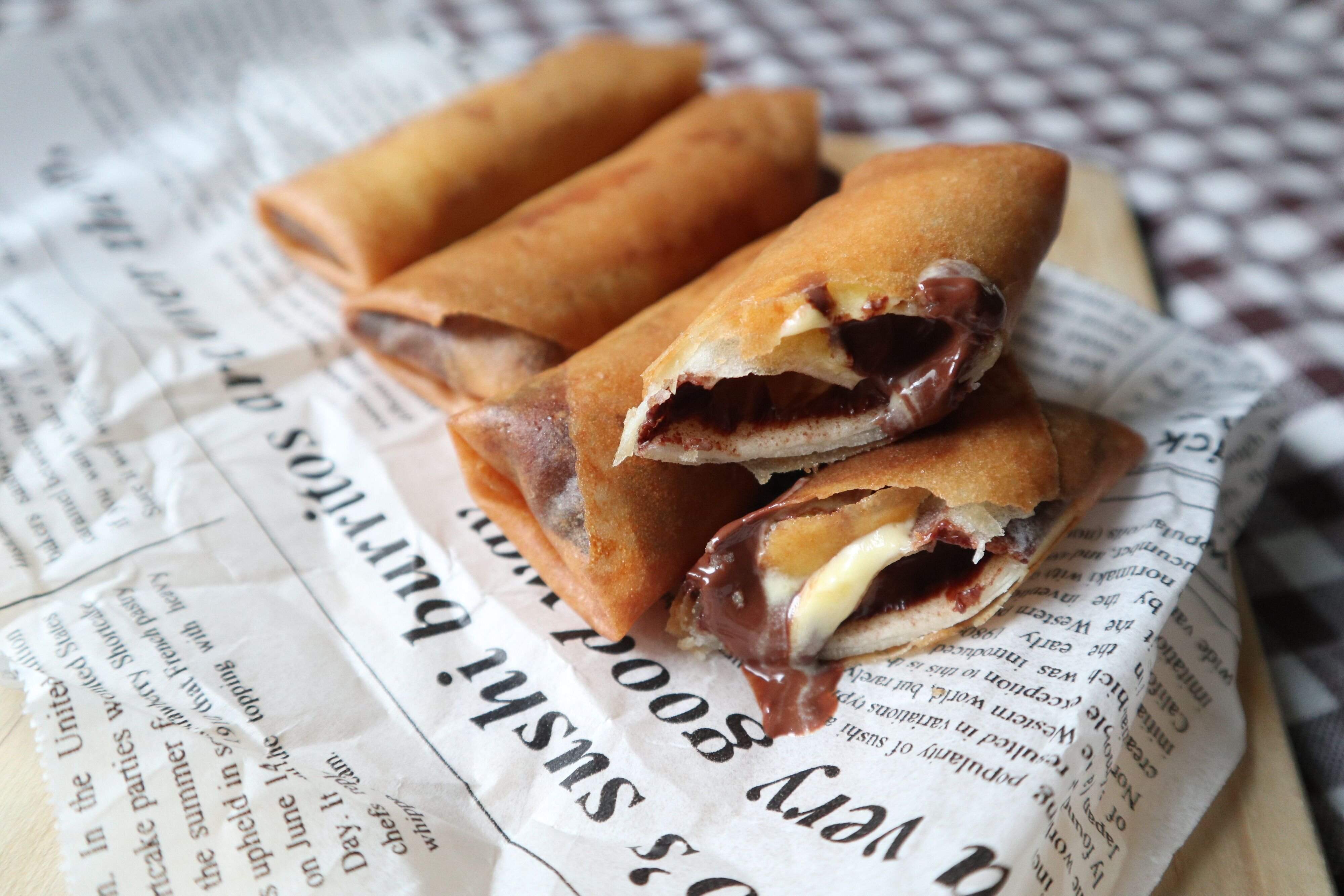 春巻きの皮にチョコレートとバナナホイップクリームを包んで油で揚げます。
