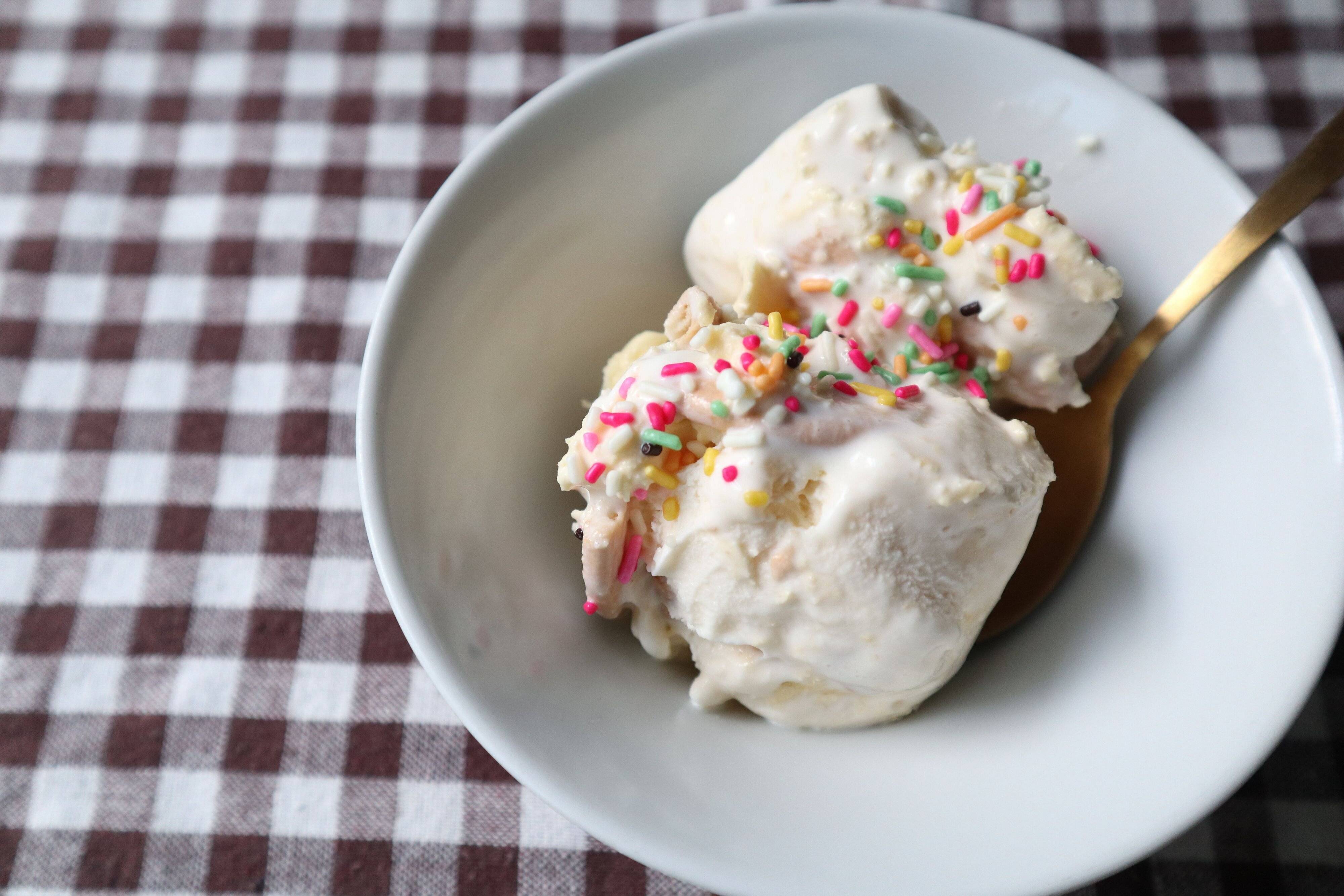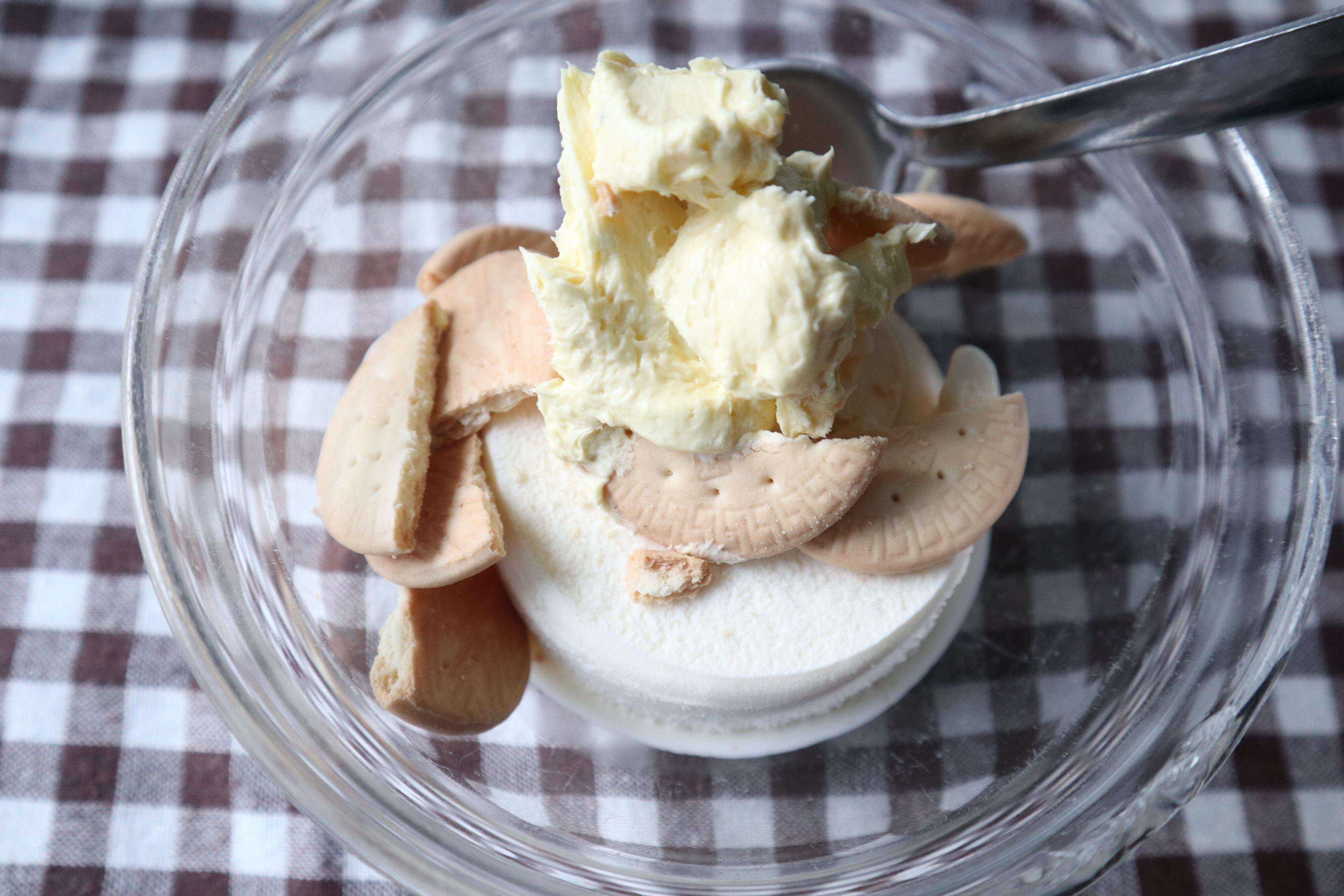 つくり方はとても簡単です。バニラアイスにバナナホイップクリーム、ビスケットをお好みの量混ぜて、一度冷やしたら完成です。