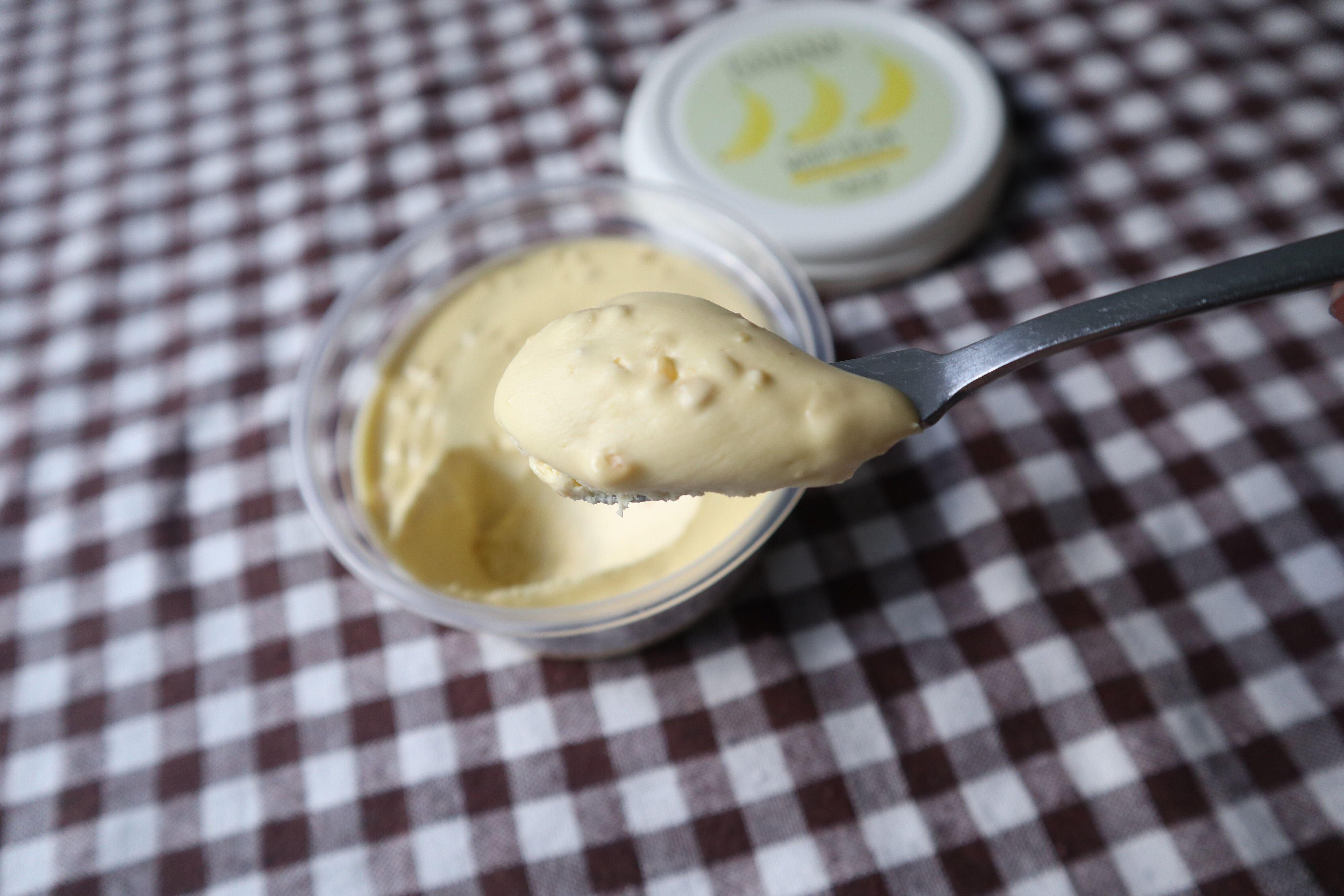 ふたを開けるとバナナの香りがふわっと漂ってきます。ふわふわななめらかなスプレッドにバナナの果肉も入っています。