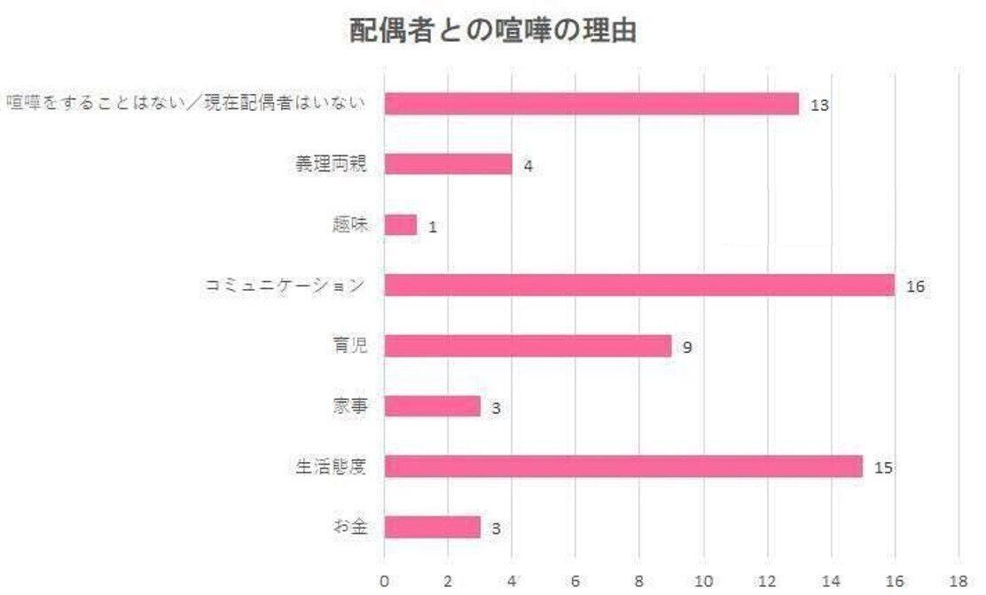 「夫婦喧嘩の理由で最も多いものは何ですか?」との質問に対しては、下記のグラフをみてみましょう。「コミュニケーション」をあげた人が最も多く、続いて「生活態度」についても数多くコメントが寄せられました。
