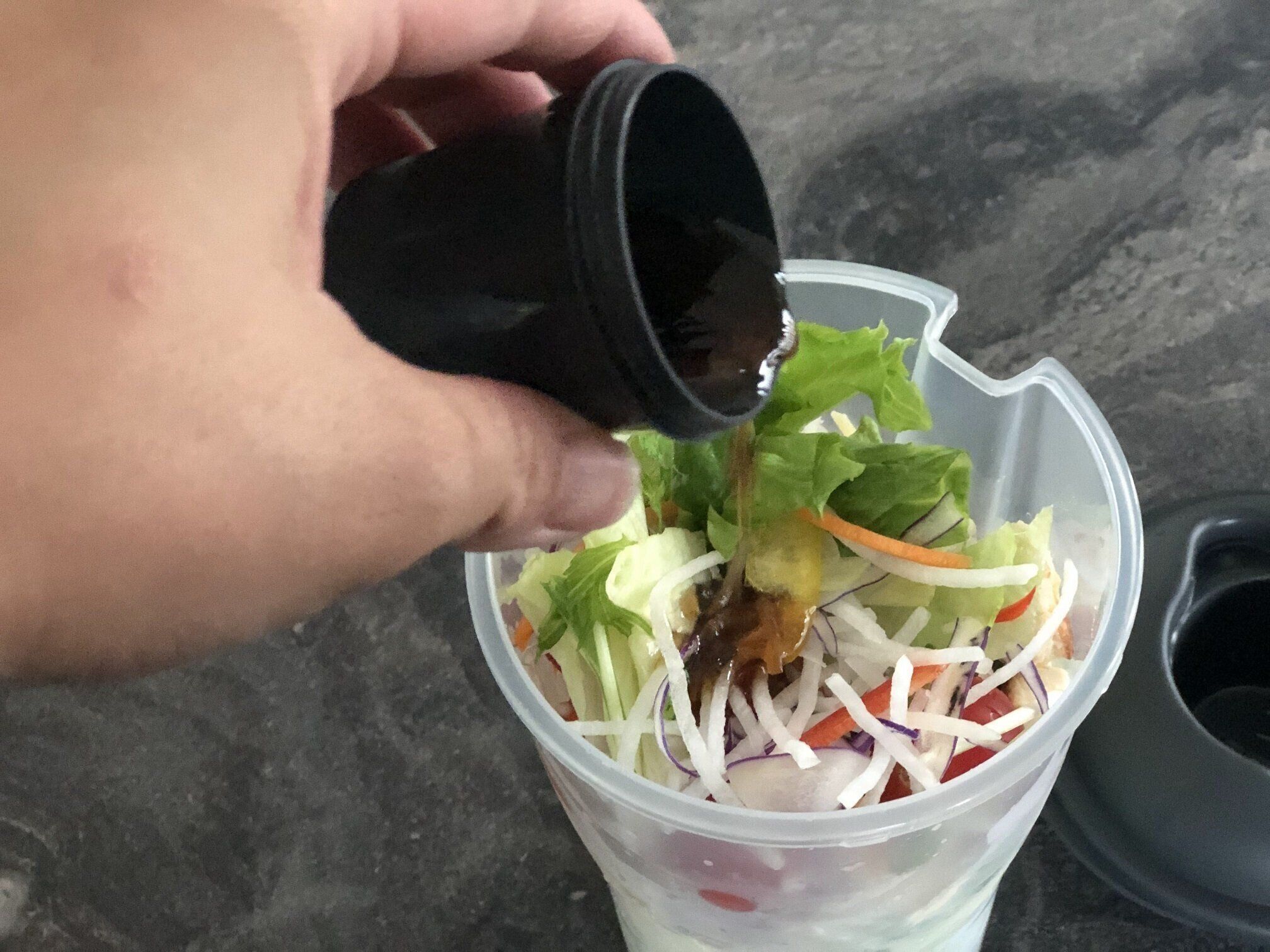 キャップにはすりきりでおおよそ大さじ4の容量の液体が入ります。でも、こぼれやすいので大さじ3がおススメです。ドレッシングを入れるのもいいですし、保冷剤を入れてひんやり生野菜にするのもよいですね。