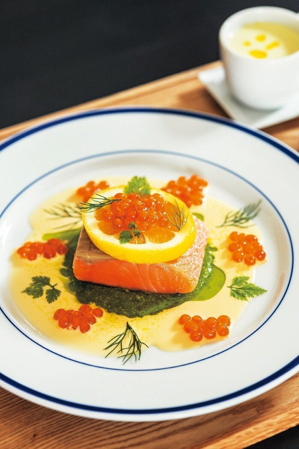 サーモンはヨーグルトメーカーで低温調理し、下にかぶの葉を使ったソースを。グリーンピースの冷製スープも添えました。完全にプロの一品。