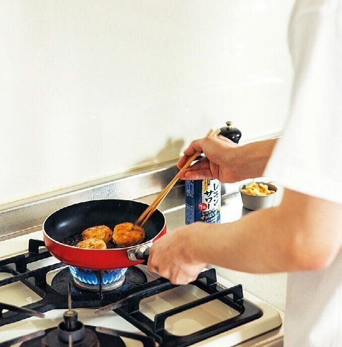 その日の主菜は、その日の仕事後に作ることが多いのだそう。お酒を飲みつつ、調理を進めます。今はもっぱら、濃いめのレモンサワー缶。