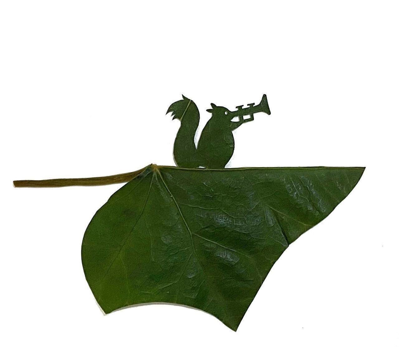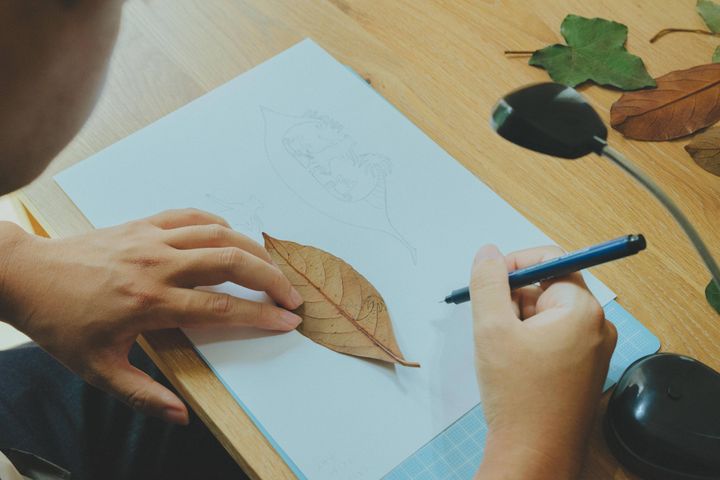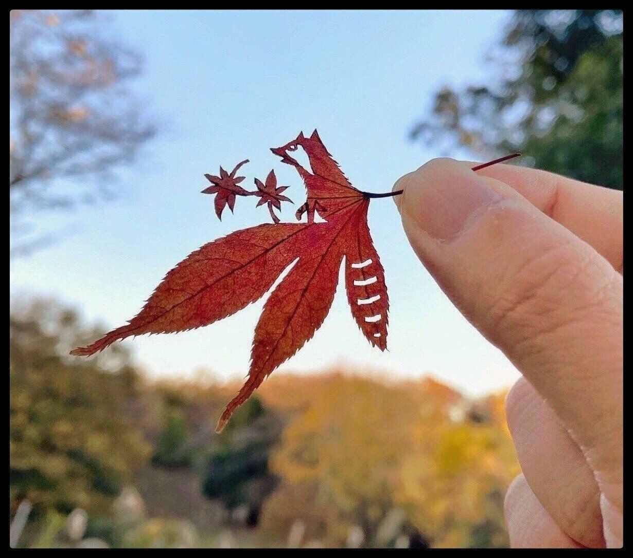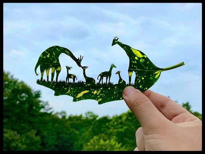 そんなとき、「切り絵って手がある!」と思いついたんです。でも、紙の切り絵をやっている人は世界中にたくさんいる。もうひと工夫必要と考えていたときネットで出会ったのが、スペインのアーティストが発信している「reaf art(葉っぱのアート)」でした。葉っぱの真ん中から上が森になっていて、そこで動物たちが草を食べている、その繊細でやさしい世界観に引き込まれた僕は、葉っぱで切り絵をすることを心に決めます。その次の日には近所の公園に葉っぱを探しに行きました。2020年、33歳のときでした。