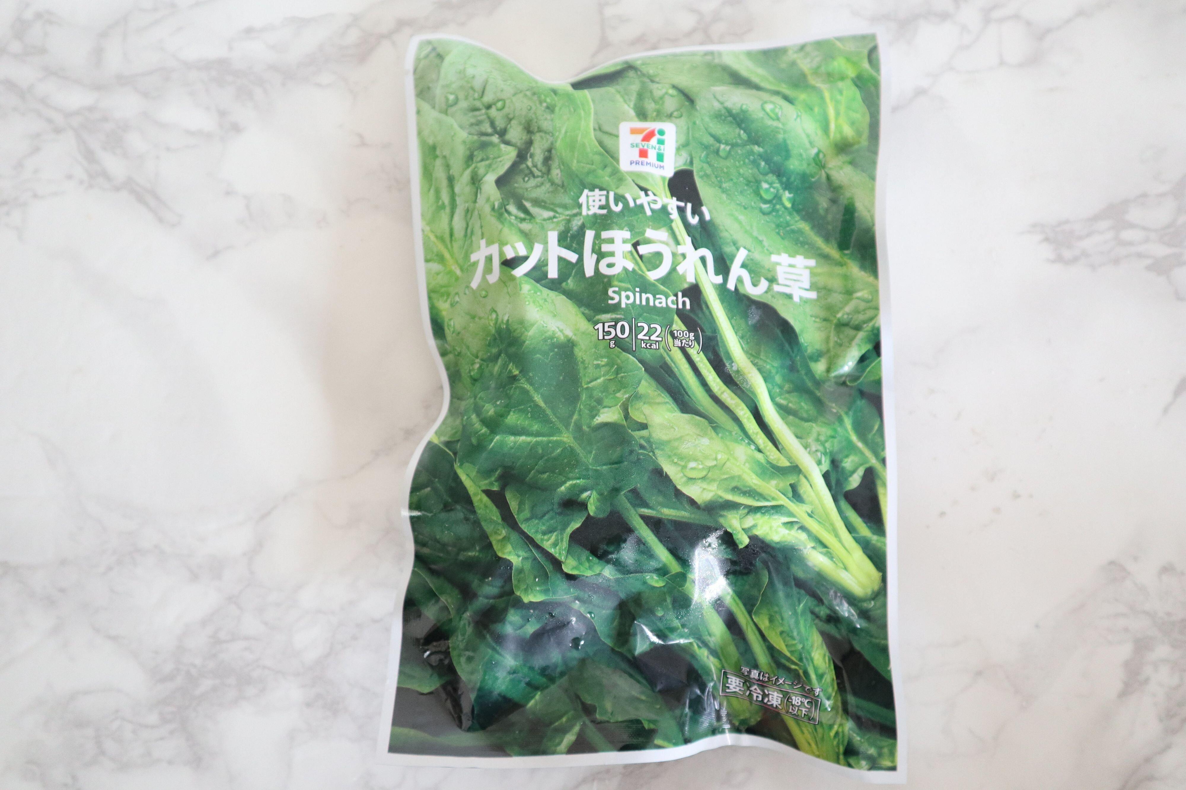 ちなみに、今回の記事で使っているほうれん草は、セブンプレミアムの「カットほうれん草」(150g円、税込108円)でした。カットずみで、使いたいときに必要なぶんだけ使えるので便利です。じつはセブンレイブンは冷凍野菜もお手ごろ価格でおすすめなんです。