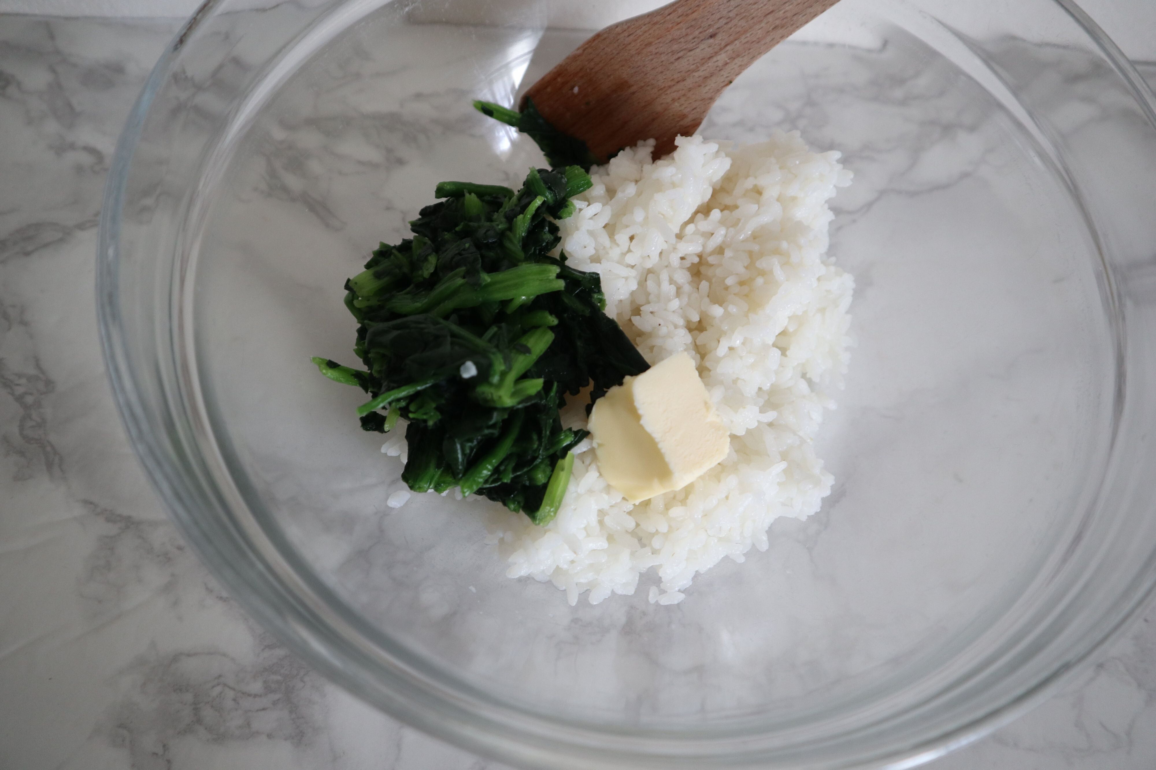 温かいご飯1膳にバター10g、冷凍ほうれん草50g(600Wの電子レンジで1分加熱)をボウルに入れて混ぜる。