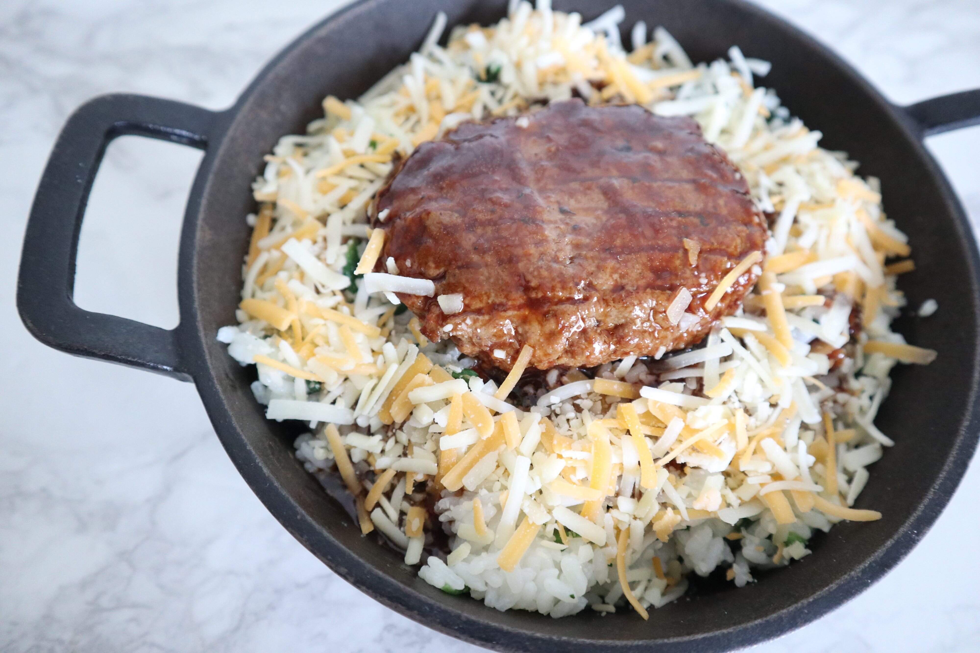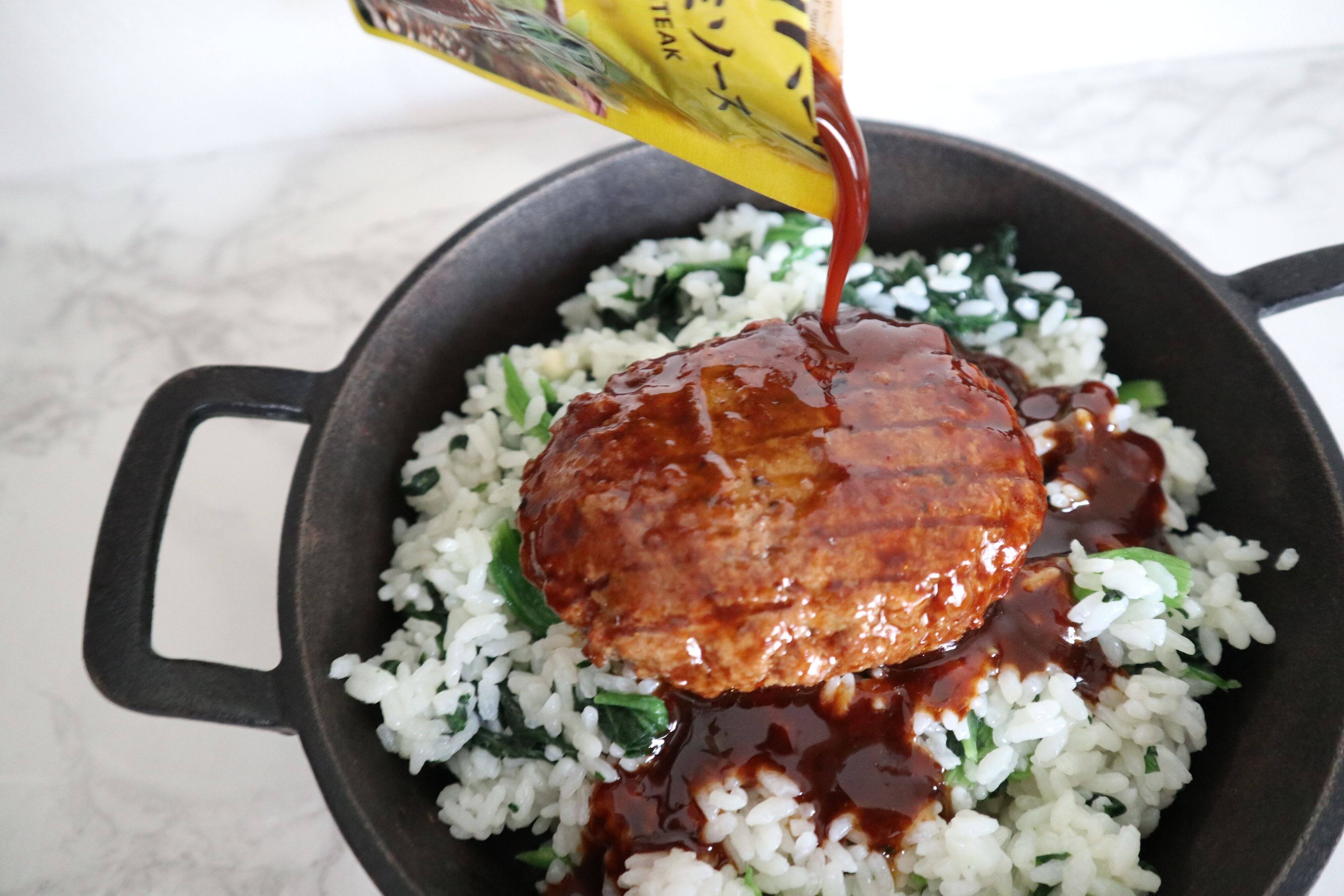 ハンバーグは600Wの電子レンジで1分加熱(後でトースターで焼くので1分加熱で大丈夫です)。スキレットにほうれん草ライスを盛り、ハンバーグをのせてデミグラスソースも全部かけます。