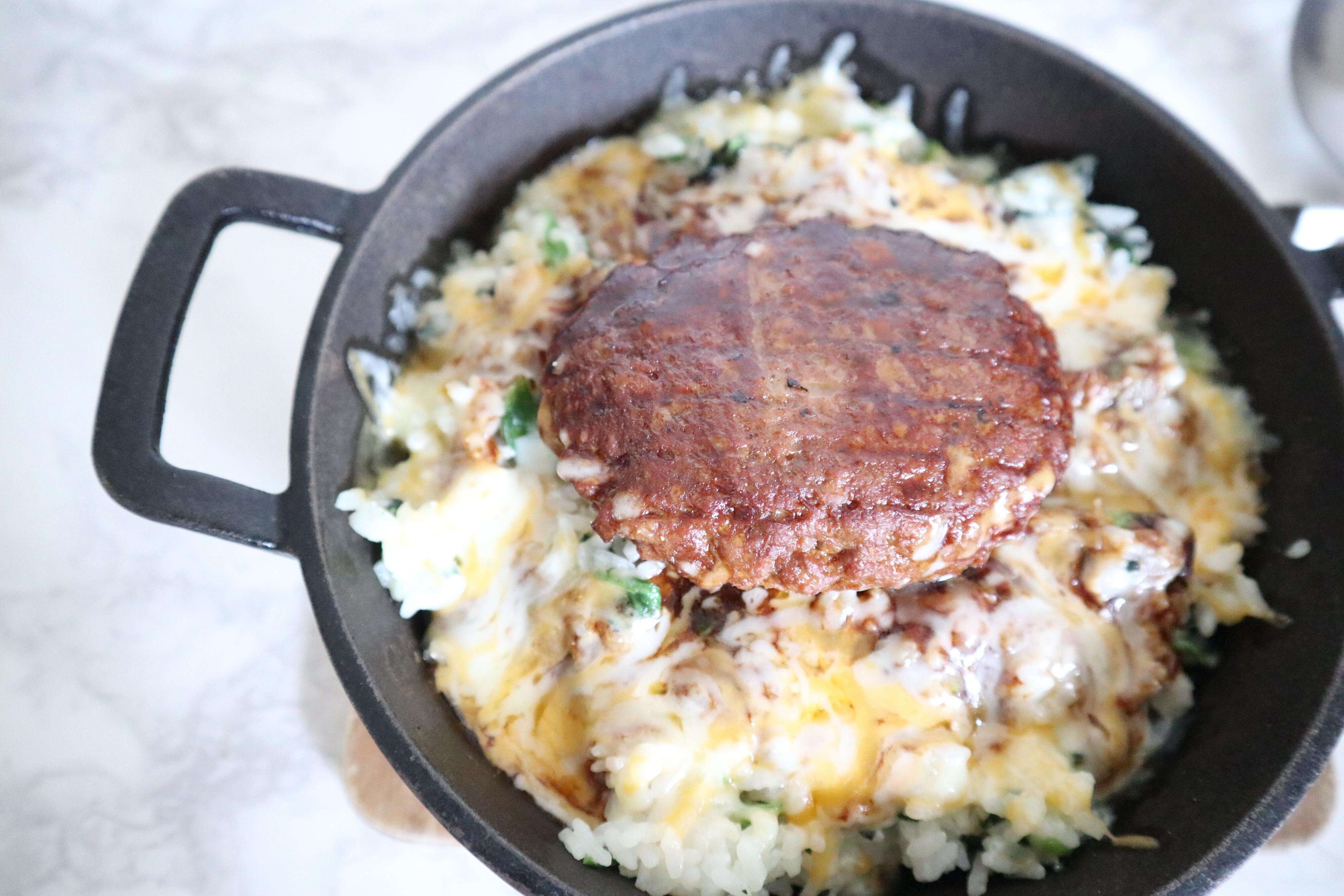 チーズハンバーグドリアの完成です。おいしいデミグラスソースをごはんが吸って最高です。とろーり溶けたチーズとハンバーグの相性も抜群です。