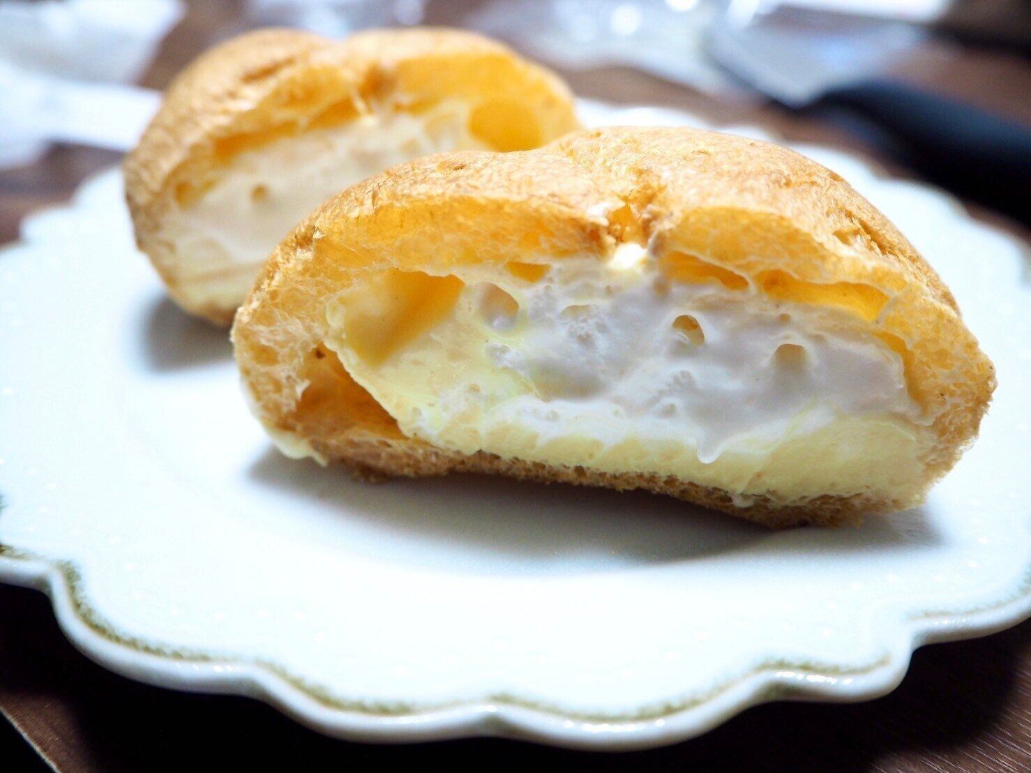 薄めで香ばしいシュー生地の中にはたっぷりの生クリームとカスタードが入っています。