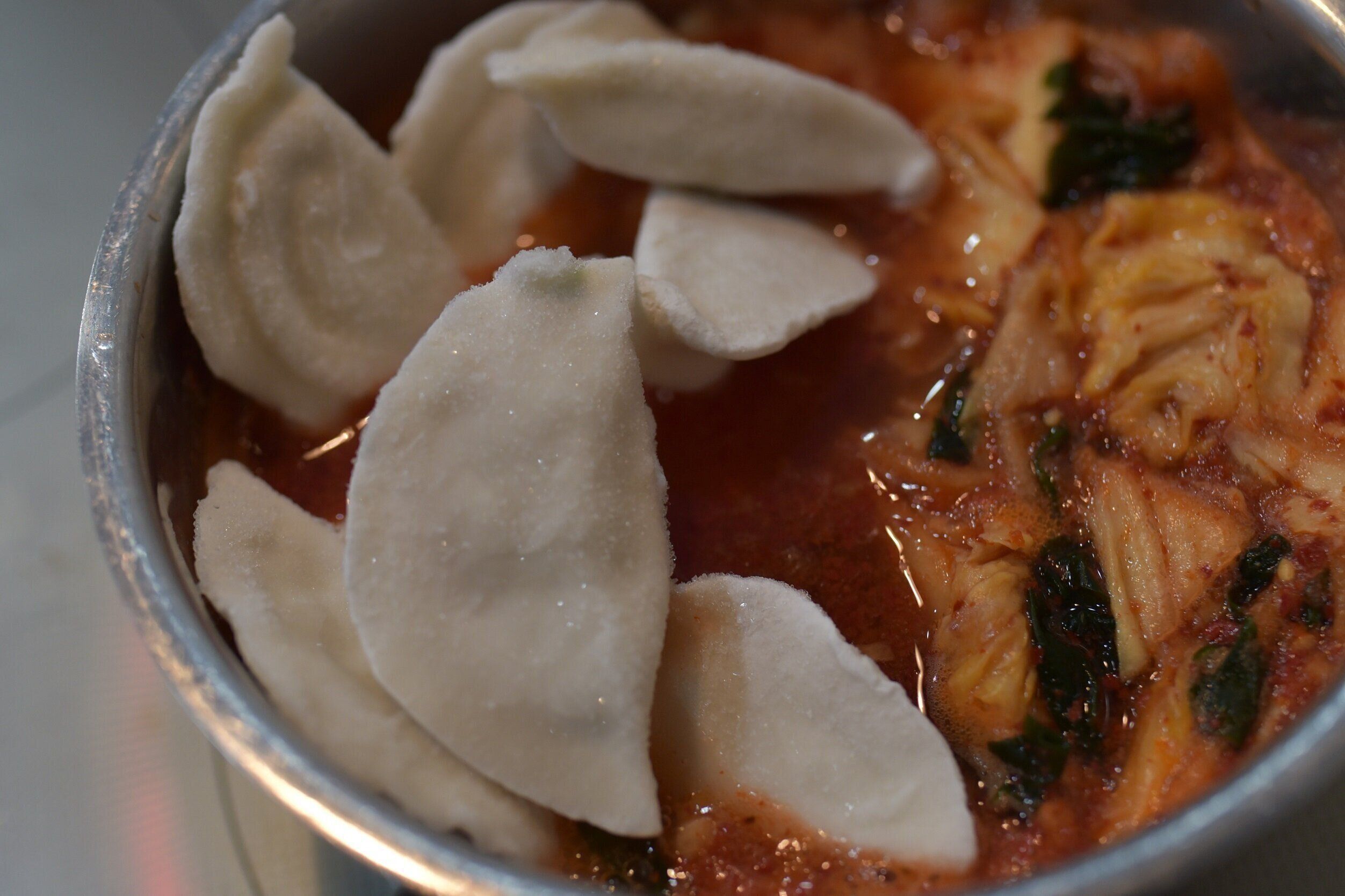 餃子のモチモチ食感が気に入ったので、スープ餃子にもしてみました。今回は、たっぷりのキムチとわかめを入れたスープです。