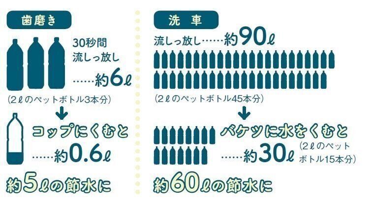 手洗いでは1分間流しっ放しだと約12L(2Lのペットボトル6本分)、食器洗いでは約5分間で約60L(ペットボトル30本分)も使用。節水の基本は小まめに蛇口を閉めることです。