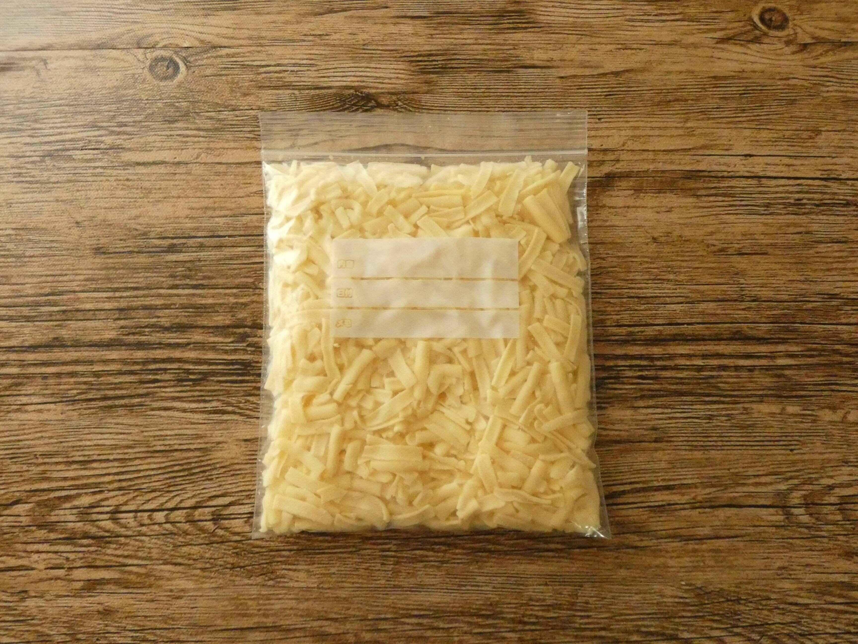 大容量でコスパ抜群ですが、この量のチーズを3~4日で使い切るのはむずかしいですよね。ですが、保存方法を工夫するとおいしく食べきることができます。ジッパーつきの袋に小分けにして、平にします。空気をしっかり抜いて冷凍保存すれば大丈夫です。
