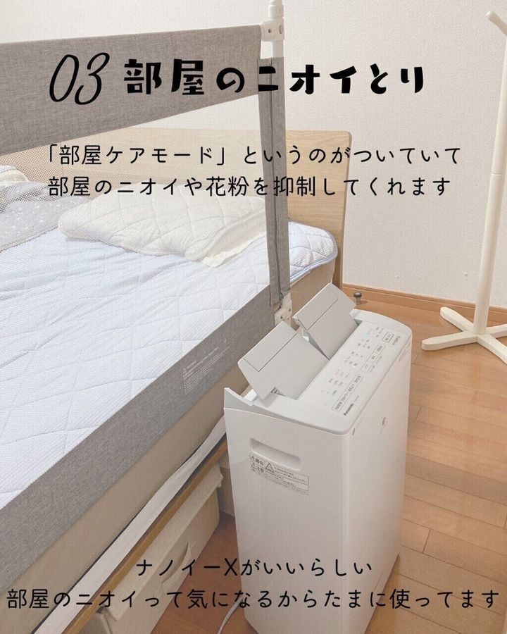 衣類ケアやクローゼットケア機能を使って、わが家の衣替えに大活躍! 雨の日のジメジメした日には、部屋のニオイケア機能を使ってみてほしいです。わが家は寝室の脇に置いてこもりがちな部屋のニオイを抑制するために使っています。ほかにも、焼肉臭やタバコ臭、ペット臭にもいいらしいです♪
