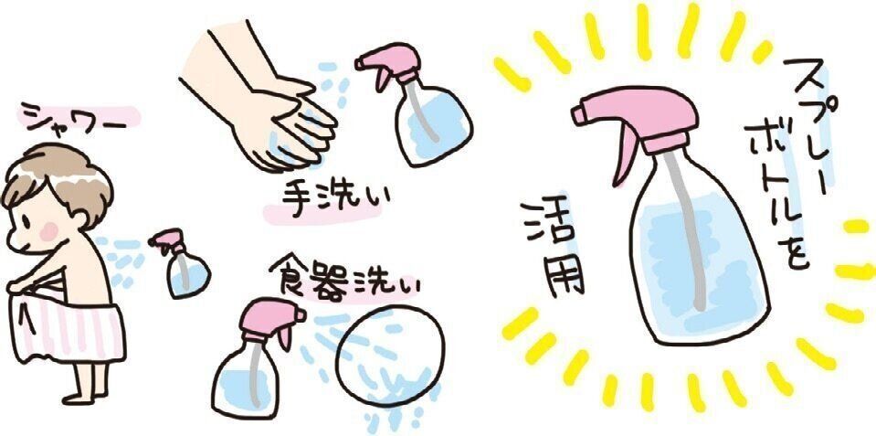 避難生活で便利だったのが100円ショップでも購入できるスプレーボトル。水を霧状に広く散布できるので、そのまま流すよりも少ない量の水で用がたせます。