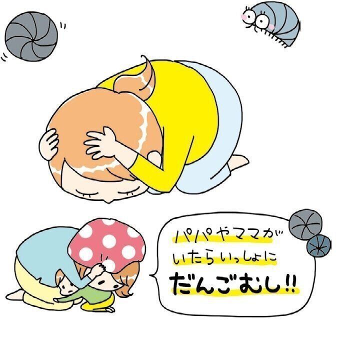 「グラグラしたら頭に手を当ててだんごむし!」。ママがポーズを取りながら誘導して。守るべき部分をきちんと伝えるのがポイントです。