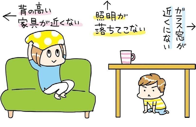 親子で場所を決めておき、地震が起きたら移動する約束を。小さな揺れのときにでも、ふだんから繰り返し実践しましょう。