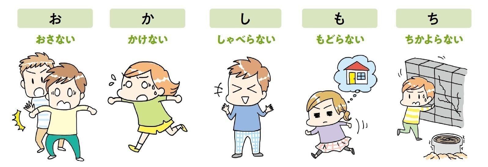 園や学校など、集団で避難をするときのポイントとして浸透してきているのが「お」「か」「し」「も」「ち」。言葉を当てながら繰り返すことで、いざというときの混乱を防ぎます。
