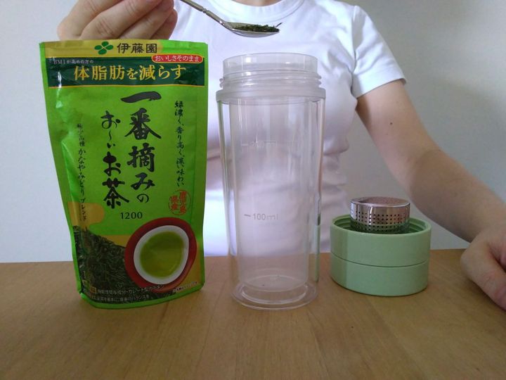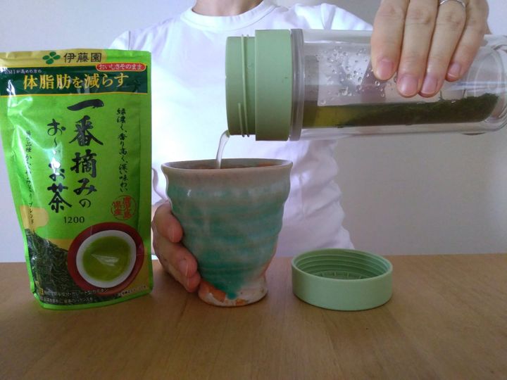 今回は「ふるふる二層ボトル」と「一番摘みのお~いお茶」を使って淹れてみました。緑茶は熱湯で淹れると苦くなりがちですが、この「オンザロック」は苦くも渋くもなく、むしろ甘すぎないところが爽やかで、ロックで飲むのにぴったりな味。冷たいのに香りもよく感じられました。
