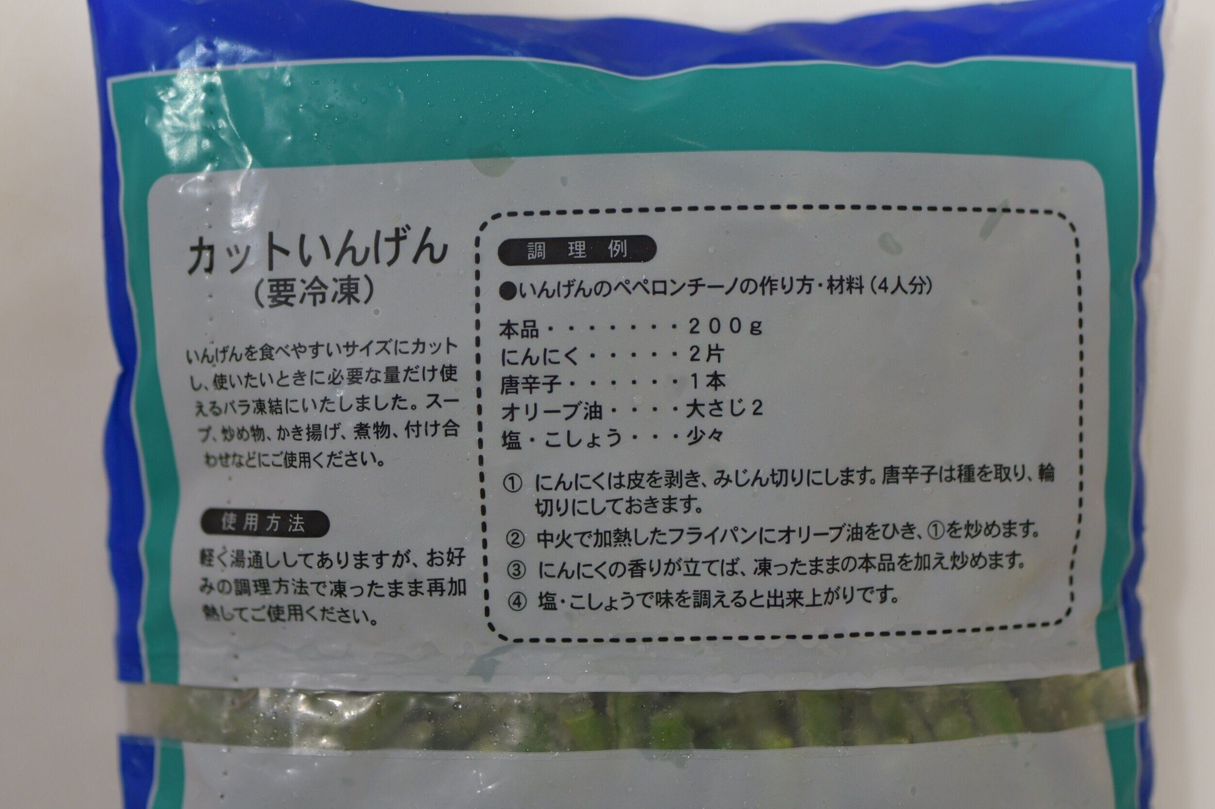 今回は、商品袋の裏面に記載してあった「いんげんのペペロンチーノ」がおいしそうだったので、さっそくつくってみました。