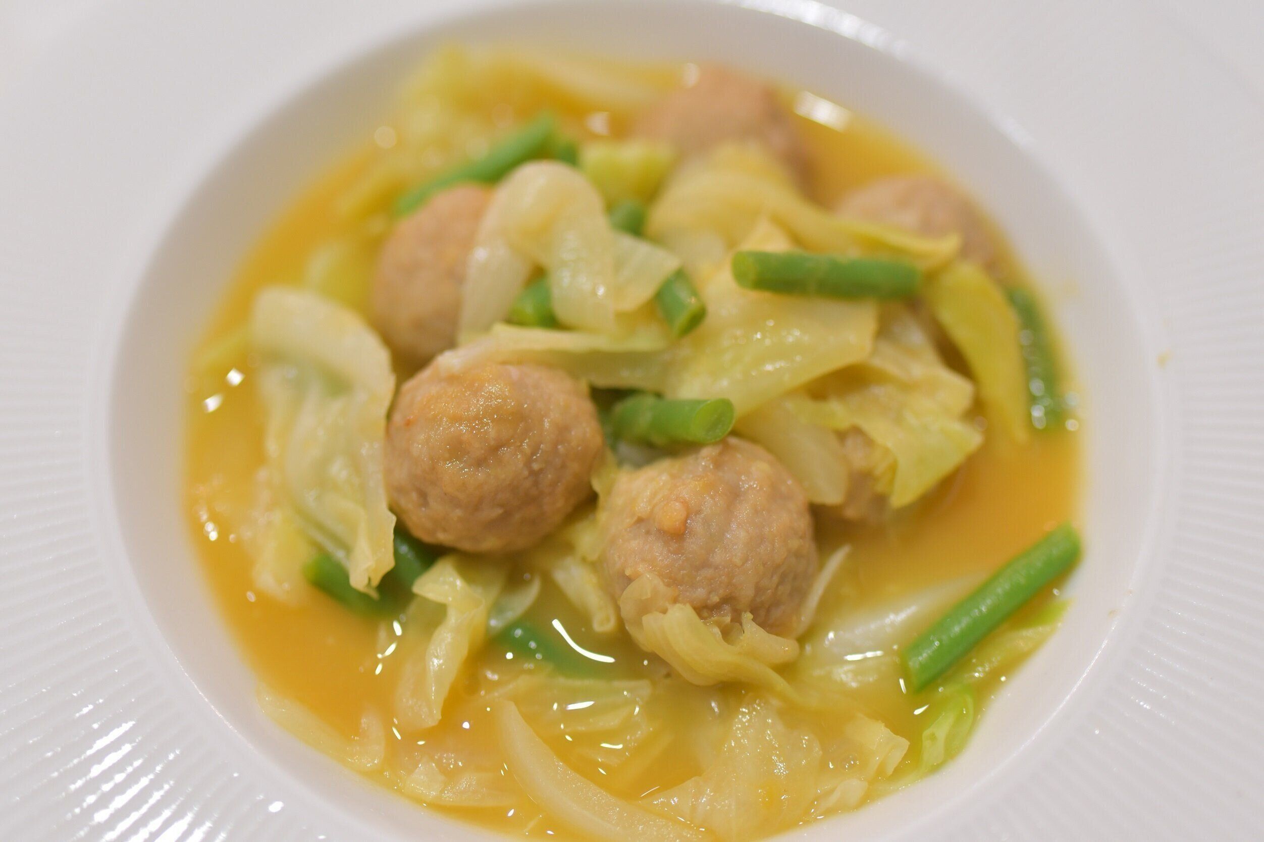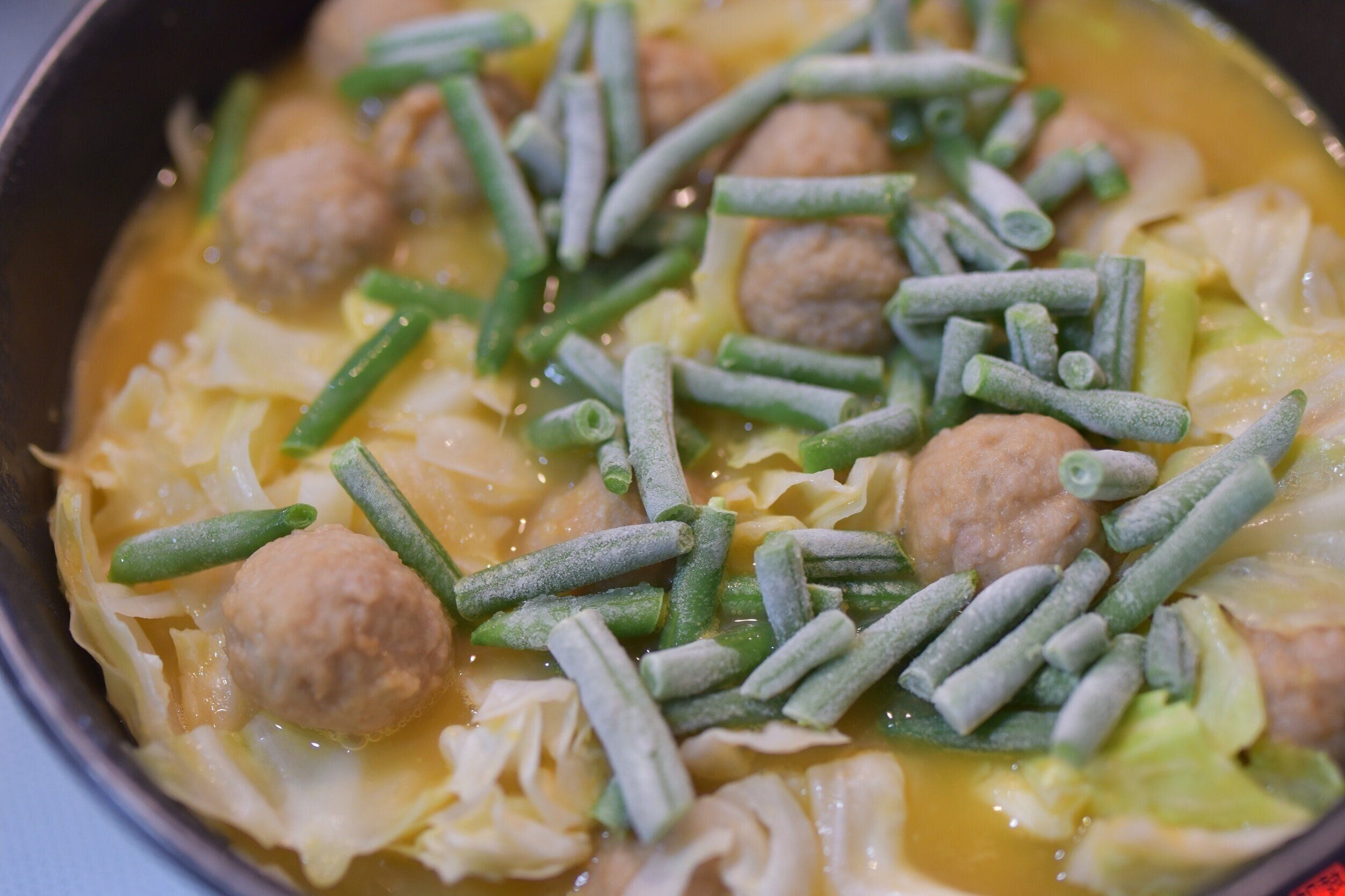 こちらはミートボールのスープです。キャベツと玉ねぎと冷凍肉団子でつくったのですが、でき上がり間近になって、彩りが悪いことに気づいて、急きょ冷凍いんげんを鍋に投入しました。