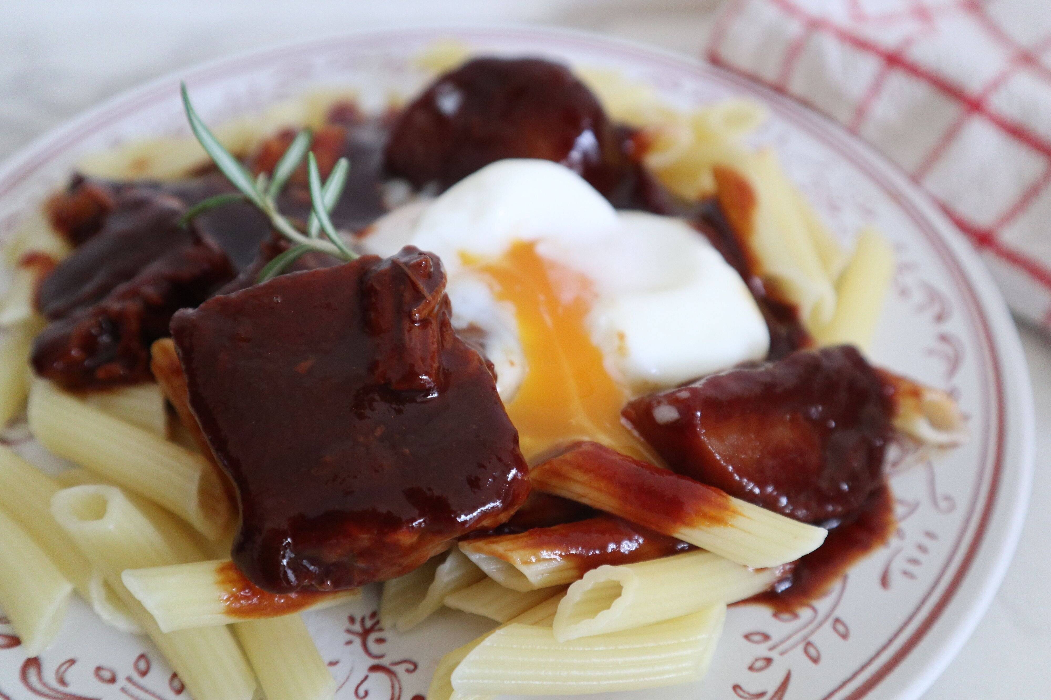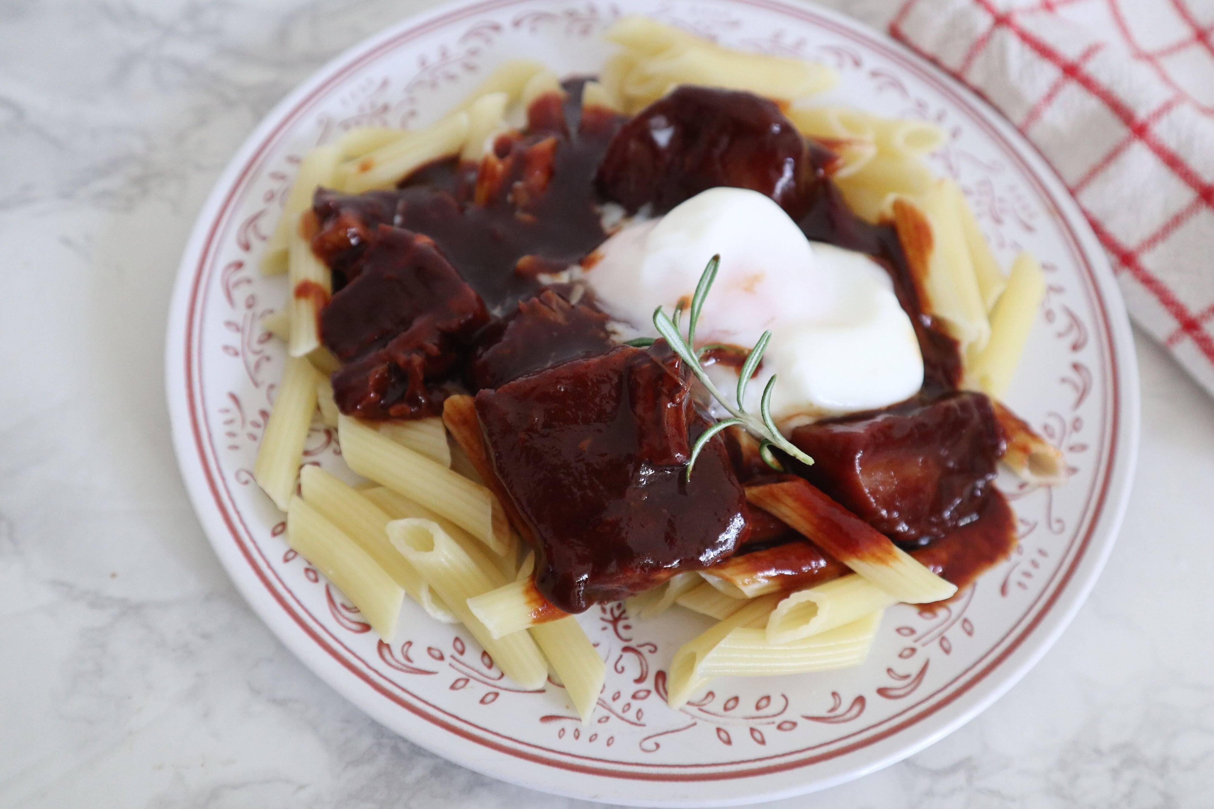 ペンネに金のビーフシチューをかけて、温玉をのせたら完成です。一皿でお腹も心も満たされます。