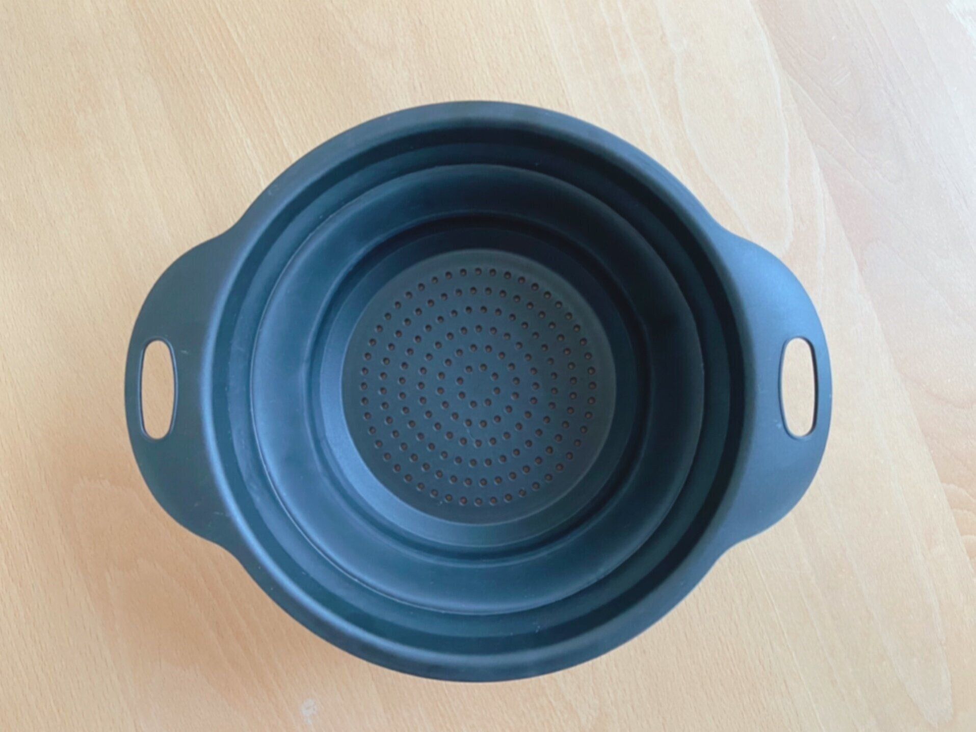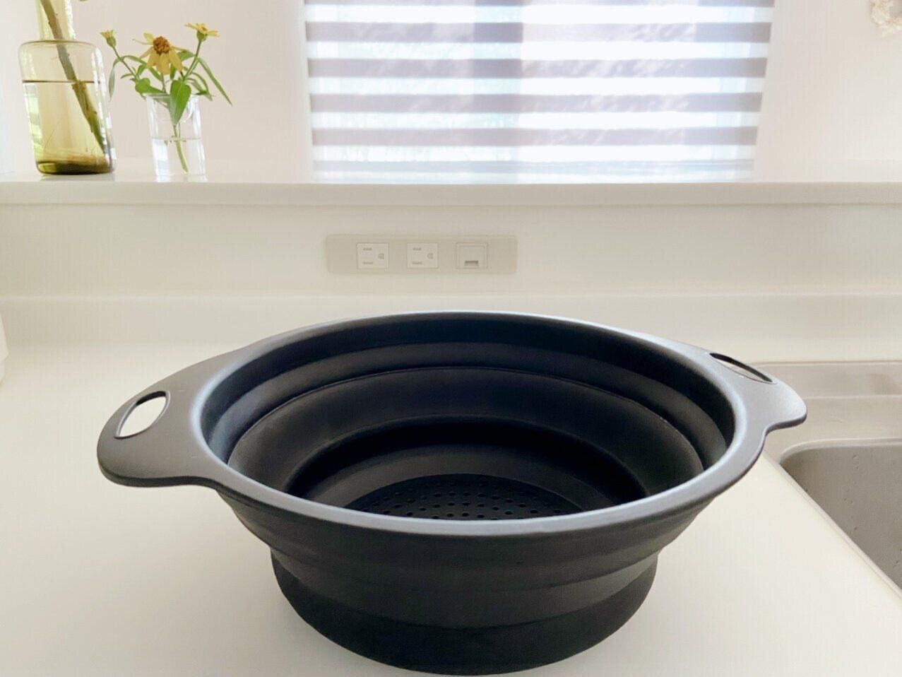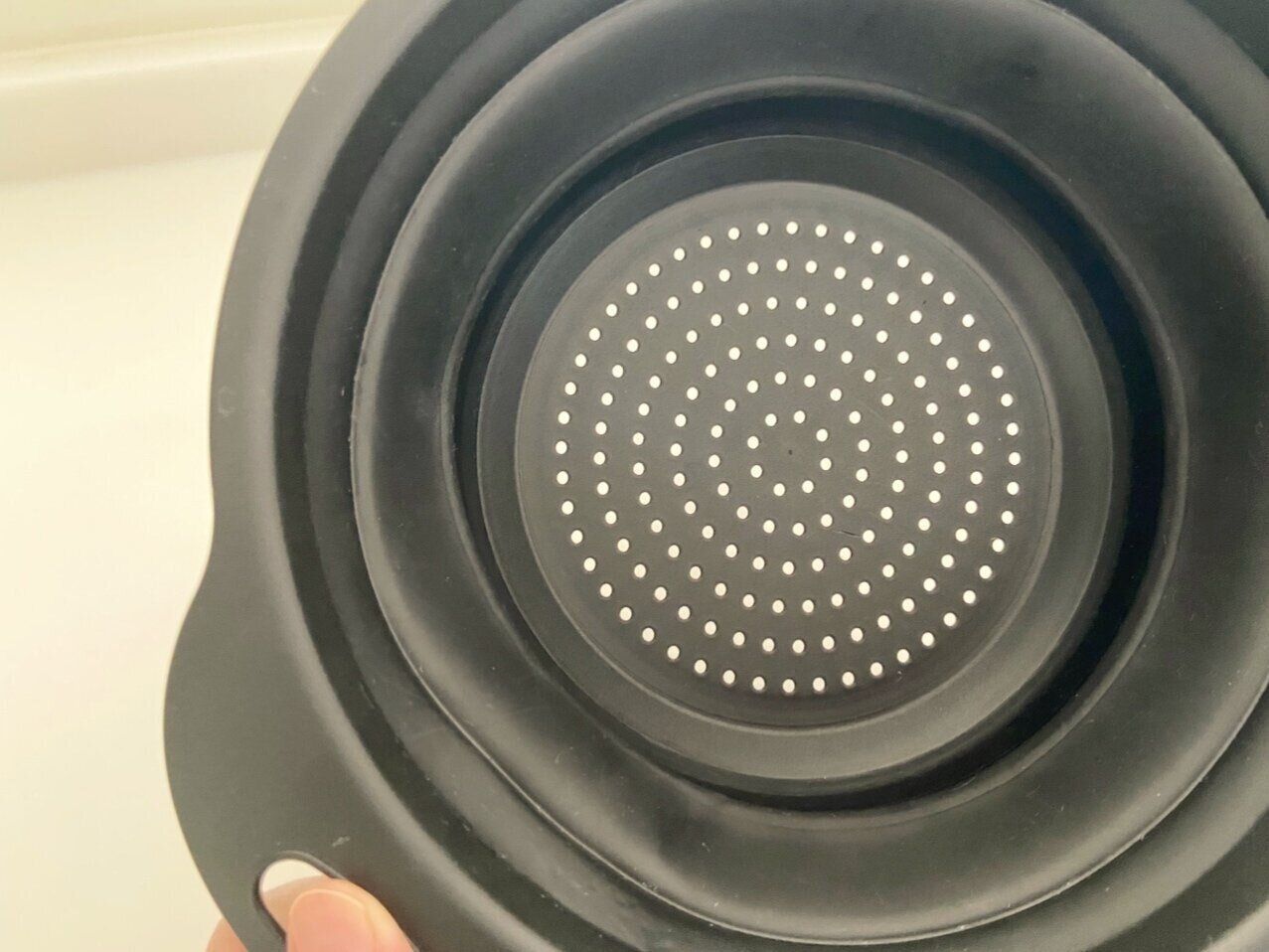 ダイソーの折りたためるザルはシリコン製で全体がフラットなのでツルッとしていて洗いやすいんです!側面に穴はなく、小さな穴が底面だけなので目詰まりの心配がほとんどありません。穴が小さく少なくてもしっかり水は切れますし、目詰まりしないので汚れが溜まることもなく洗いやすいためザルを衛生的に保つことができます。