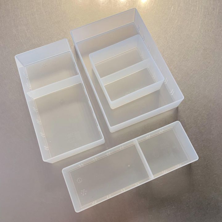 3つ目は小物整理用のトレーです。サイズは4種類あり、組み合わせることでさまざまなサイズの引き出しやケースを整理することができます。また、可動式の仕切りが1つずつついています。
