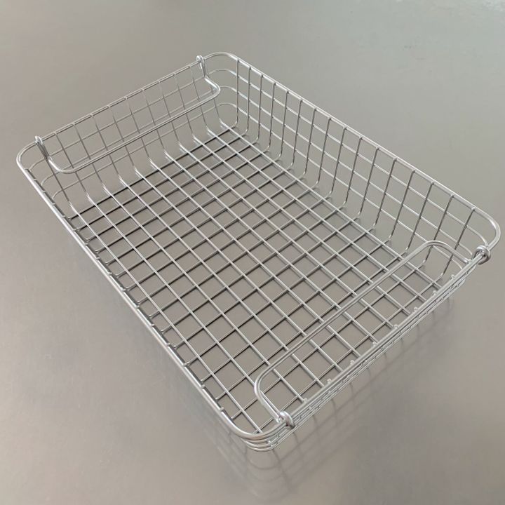 2つ目はステンレスワイヤーバスケットシリーズです。持ち手を内側に入れると積み重ねができ、サイズは7種類あります。