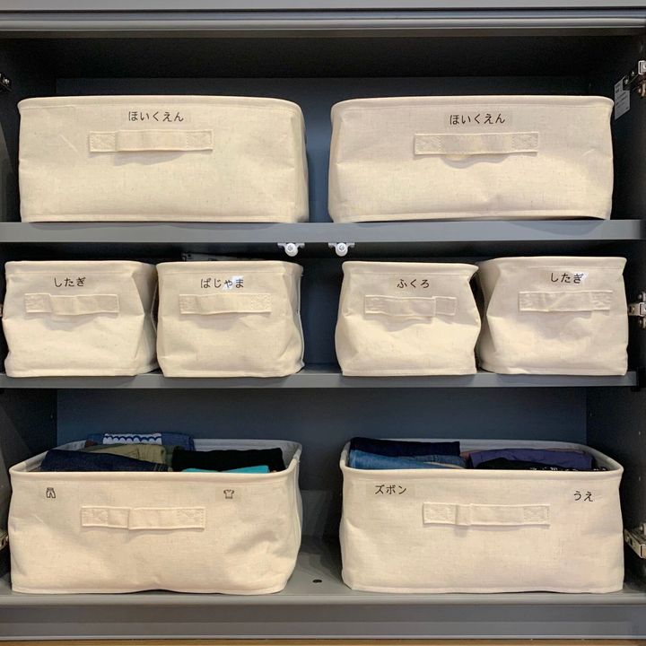 おもに、子ども服やおもちゃの収納に使っています。布の部分がやわらかすぎず、しっかりしており自立します。そのため、中にたくさんのものを入れても、形がくずれたり倒れたりすることはありません。また、布の部分がやわらかすぎると、フニャフニャとしてしまい子どもが持ち運びにくいのですが、「無印」商品はしっかりとしているので、子どもでも扱いやすいです。