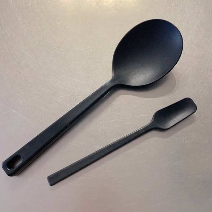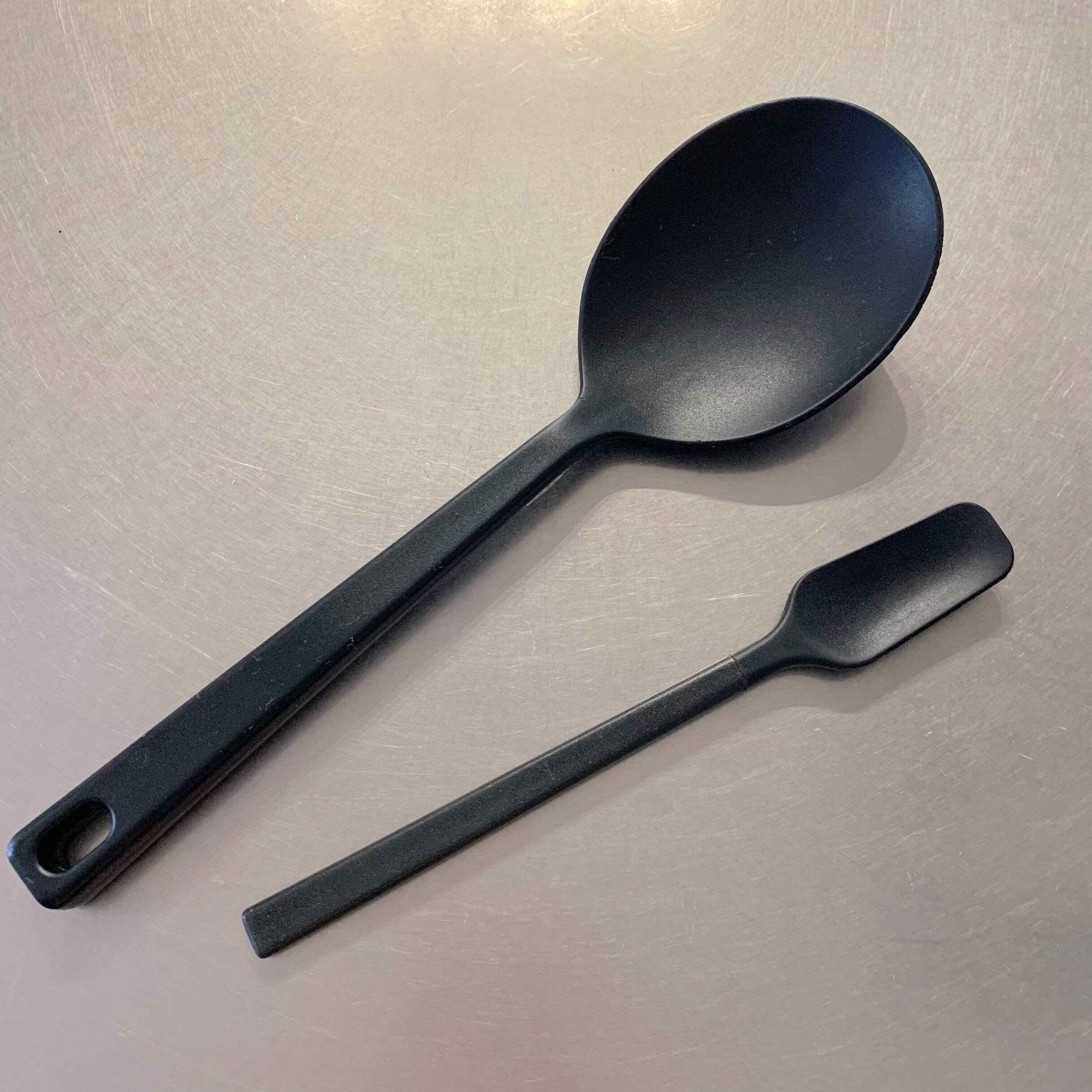 スプーンのサイズが絶妙で、さすが無印良品だと感じました。大きいスプーンは、調理にも盛りつけにも使えるサイズです。小さいスプーンは、ジャムなどの瓶の中身だけでなく、レトルトパウチや缶詰の中身まできれいに取り出すことができます。シリコーン部分に適度な硬さがあるので、柔らかすぎて使いにくいということもありません。