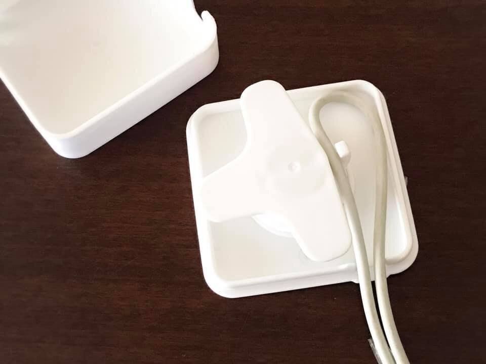 巻き取り方はとっても簡単。本体からフタを外し、2つ折りにしたケーブルの中心をフックに引っかけ、ケーブを出す穴の部分から残りのケーブルを出します。