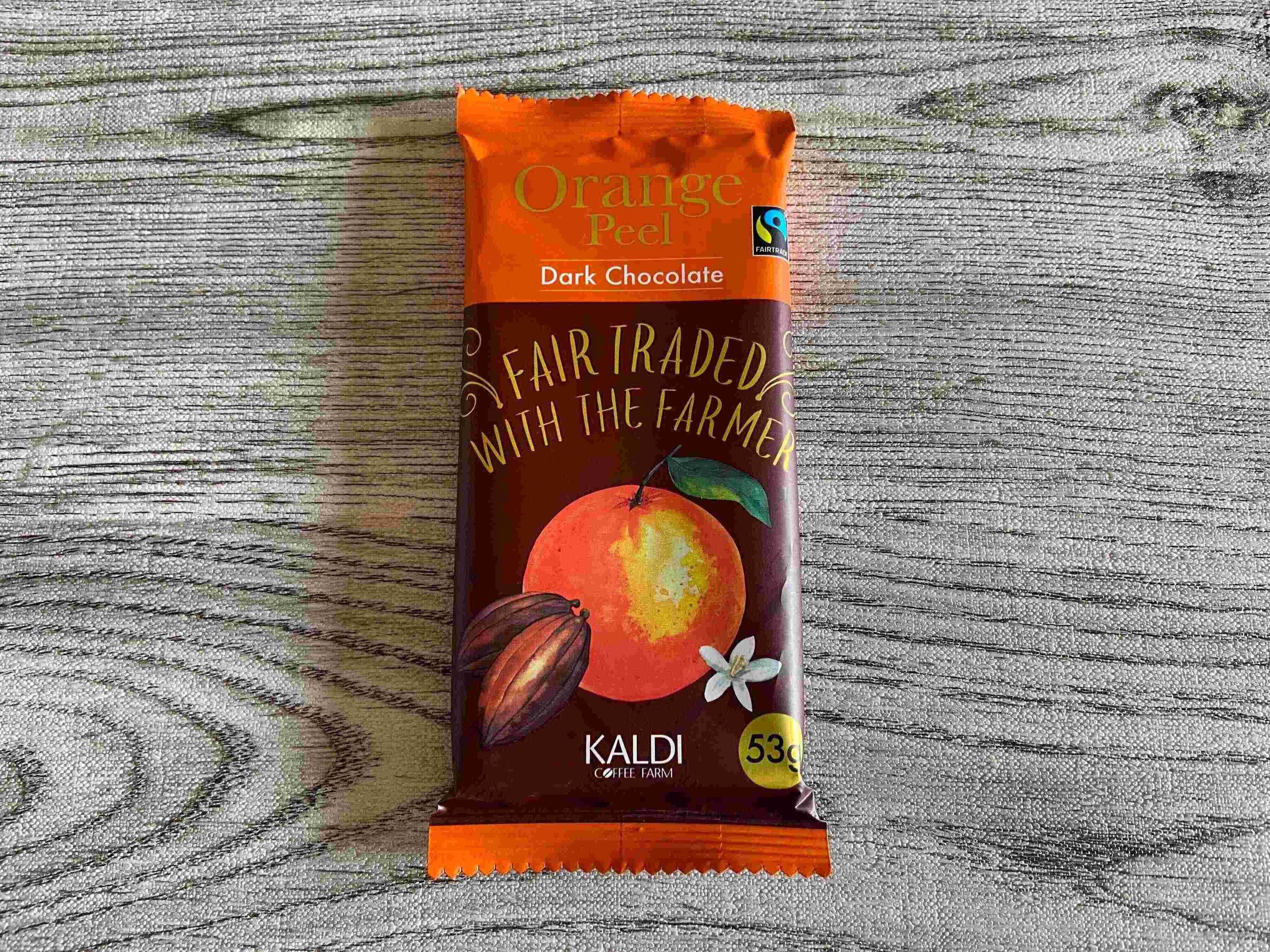 「フェアトレードチョコレートオレンジピール」(購入時:185円税込)はオレンジ色のパッケージが鮮やかでかわいいカルディオリジナル商品。