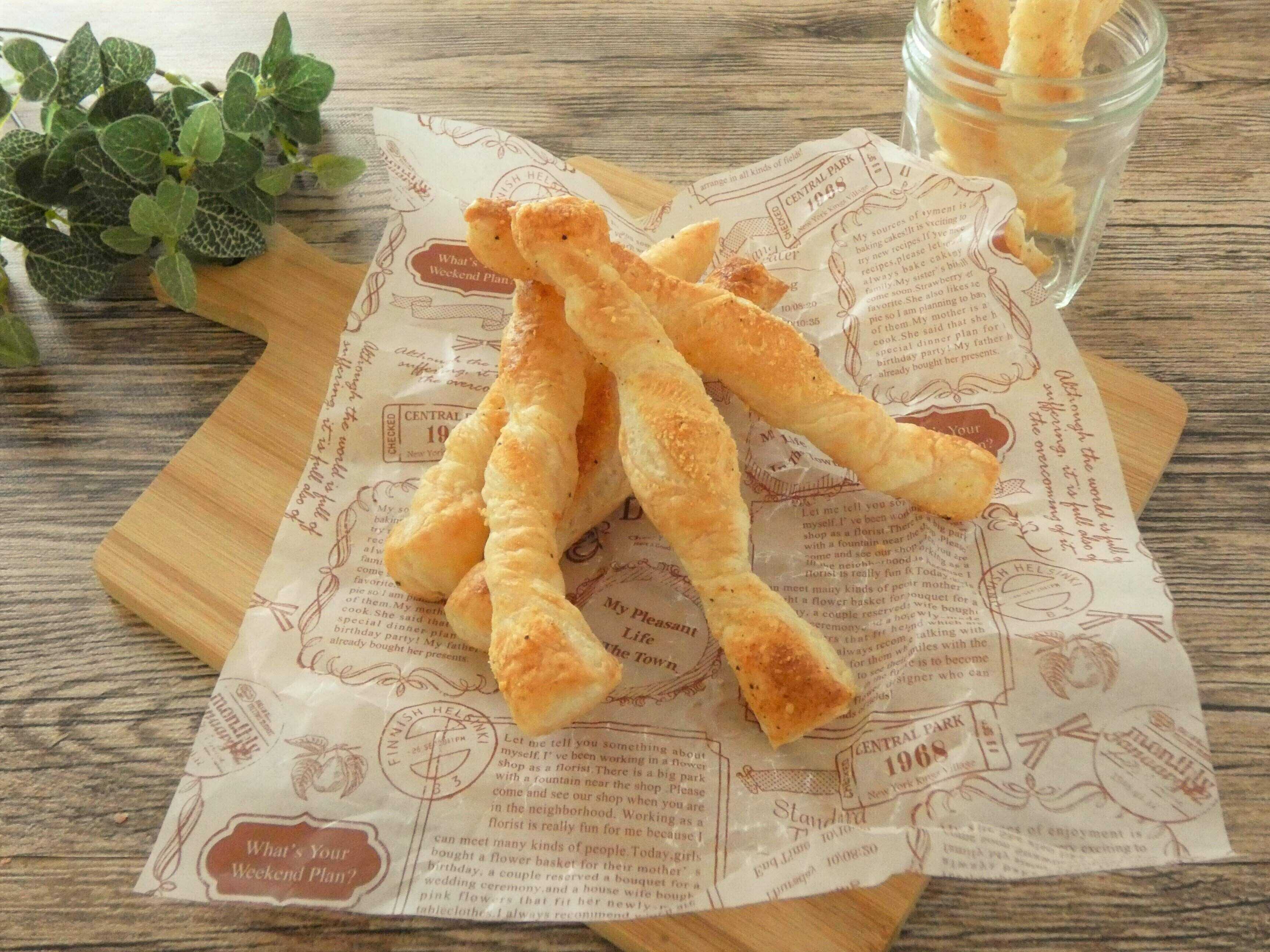 冷凍パイシートに粉チーズと塩こしょうを振って細長くカットし、ねじって焼くだけ!おつまみにピッタリなチーズスティックパイになります。